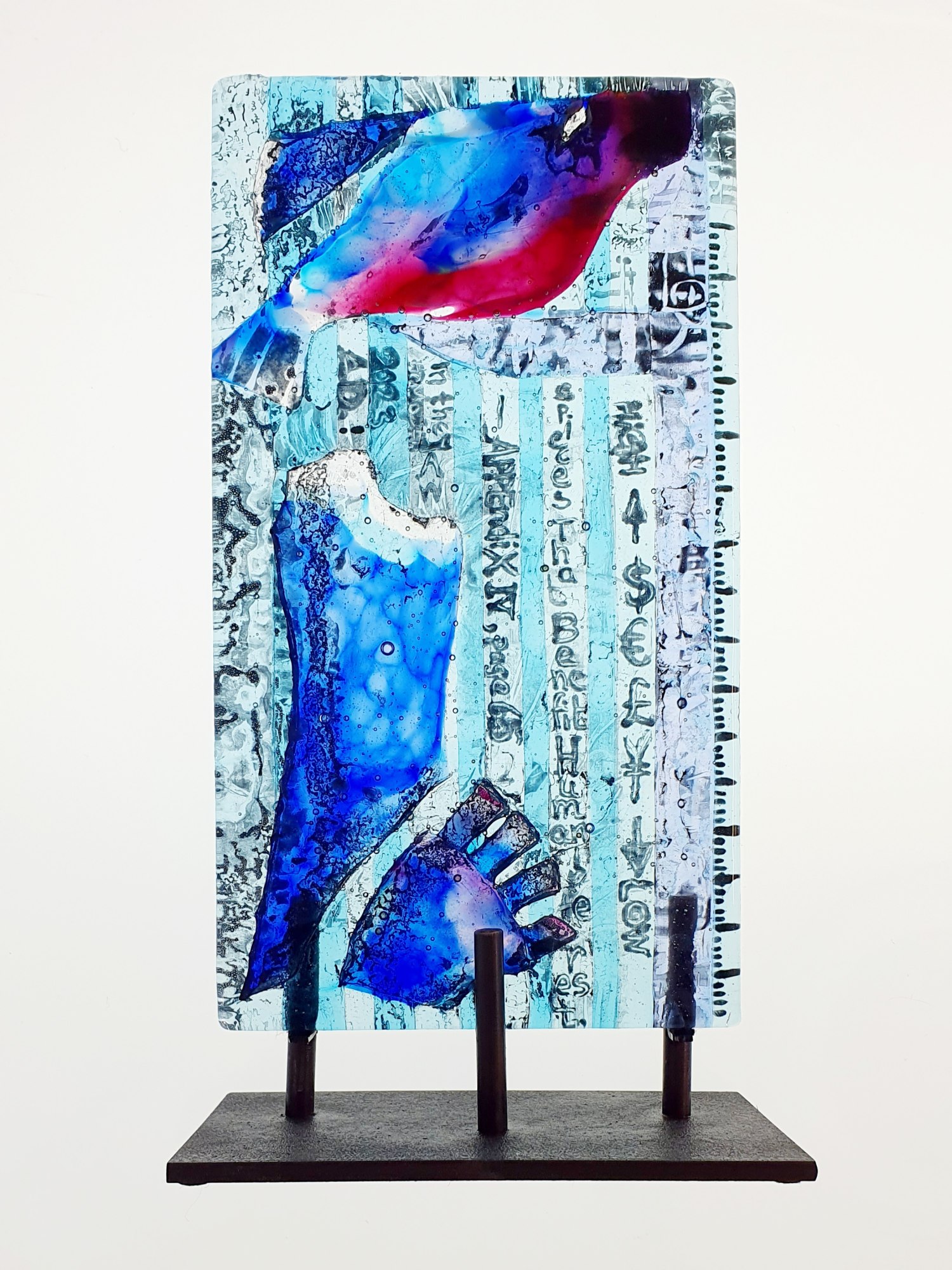 Transparent glass in shades of blue and lavender, fused several times to form a 9 mm thick panel. Textured back and black enamel paintings inside the glass. Mounted on an iron base. Dimensions without base 265X145 mm. Transparent glass that you can see through. Best placed in a window, but also in a room against a light wall.