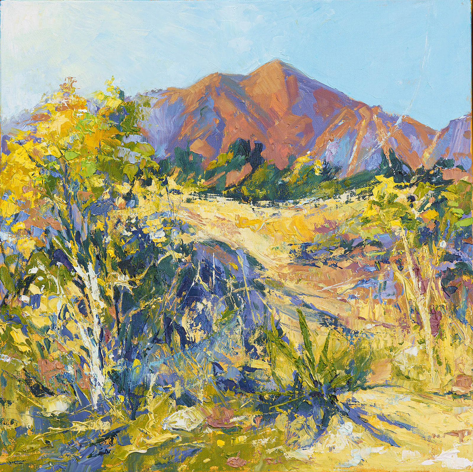 The golden hour in autumn on a canyon trail. Rich golds and greens capture the sunlight and texture of the trail and vegetation, while warm sunlight creates a golden glow on the cliffs in the distance under a perfect October sky.
