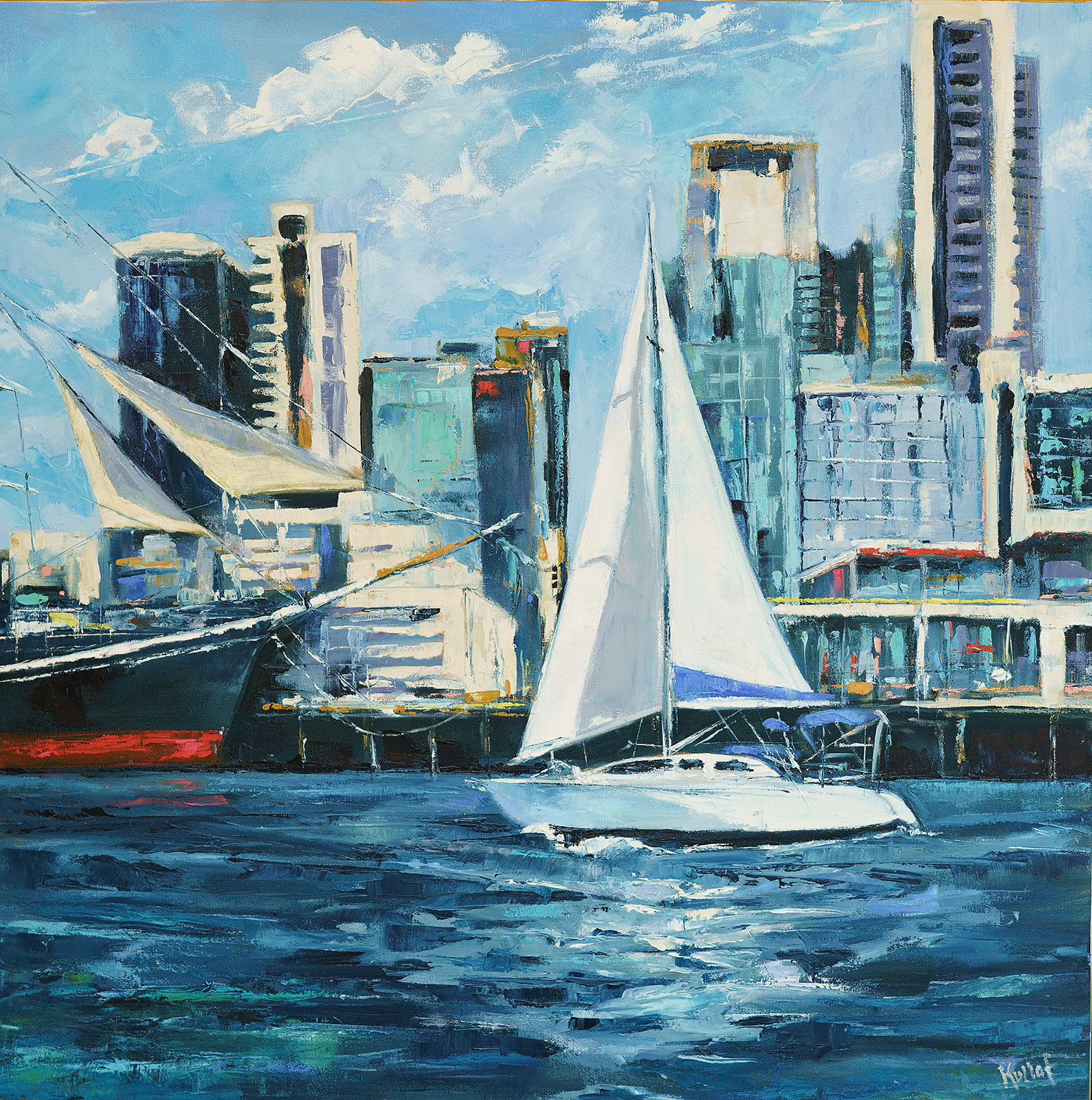 A picture perfect day sailing on San Diego Bay with the city in the distance, lots of depth and geometric form in this colorful landscape.