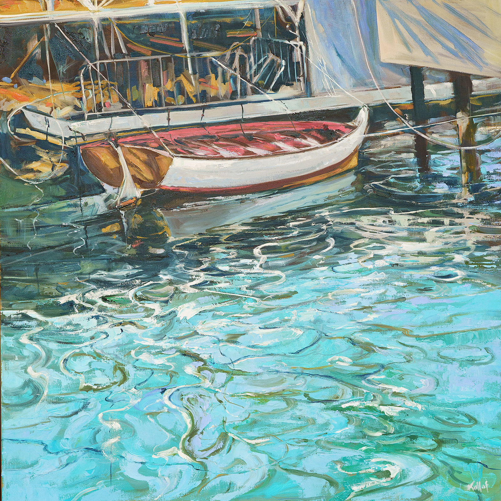 A little red skiff reflected in the aqua blue waters of San Diego Bay on a sunny day.
