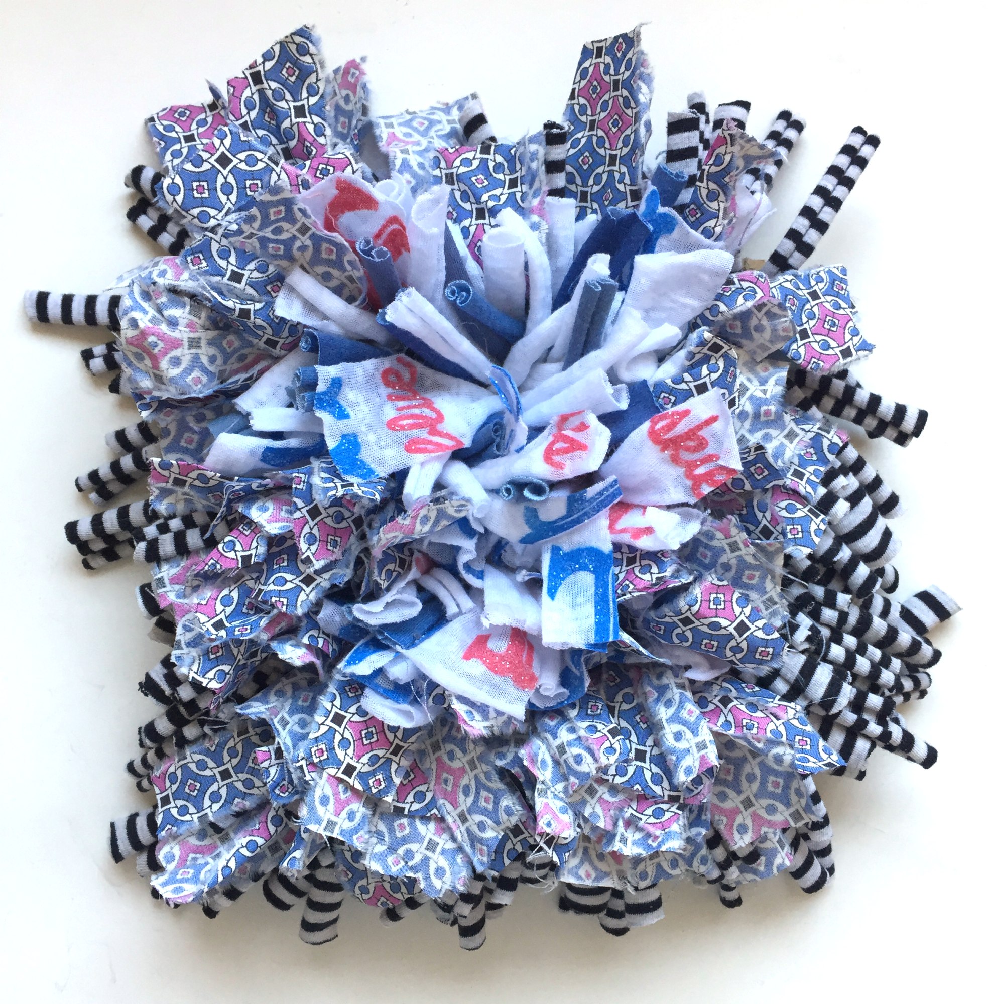 Torn/cut into strips and knotted to a cotton warp wrapped on MDF.