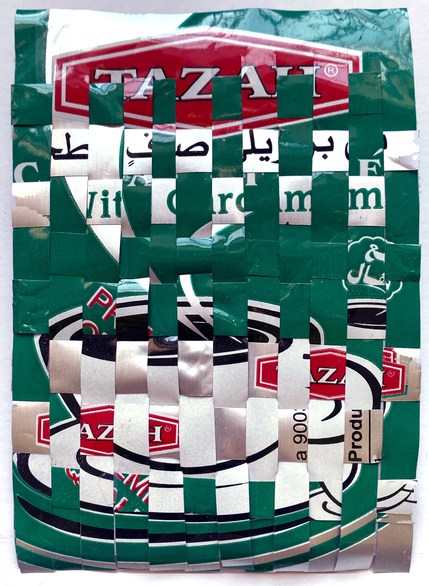 I made this during the COVID quarantine. I experimented with my paper weaving technique upon various items from around the house. Tazah is a Lebanese coffee and has cardamom in it. Mmmmmmm