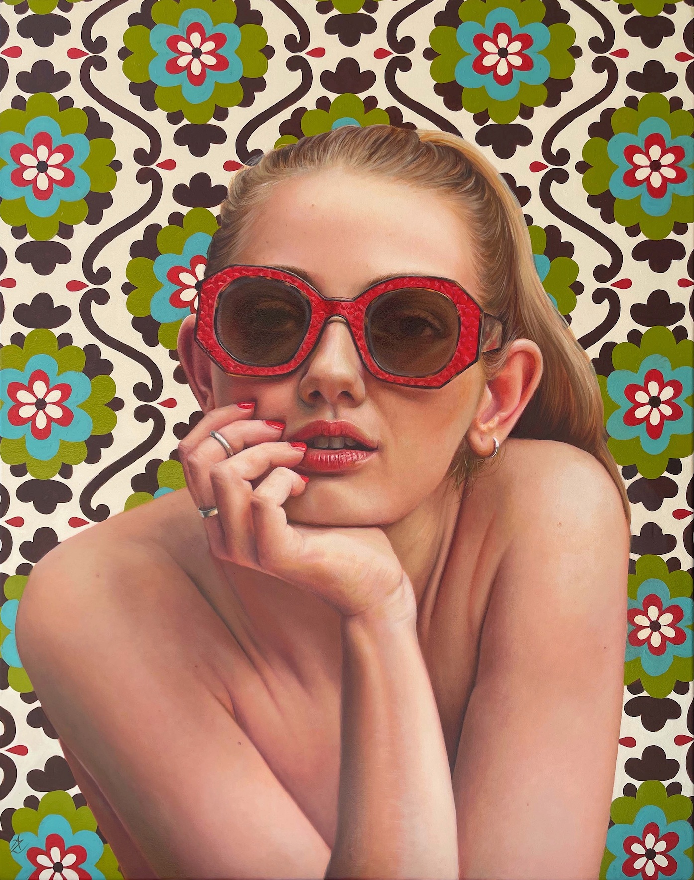 This portrait of my youngest daughter, Bec, is part of my current investigation into the turbulent years of my younger self. Just as Bec leaves behind her teen years my own fragile memories of this era fight for my attention. The incorporation of 70’s wallpaper is my way of conjuring the era of my own youthful endeavours. This awakening evoked in me a longing to not only envisage my own adolescent self but to also give my recollections voice, power and appreciation through my paintings.