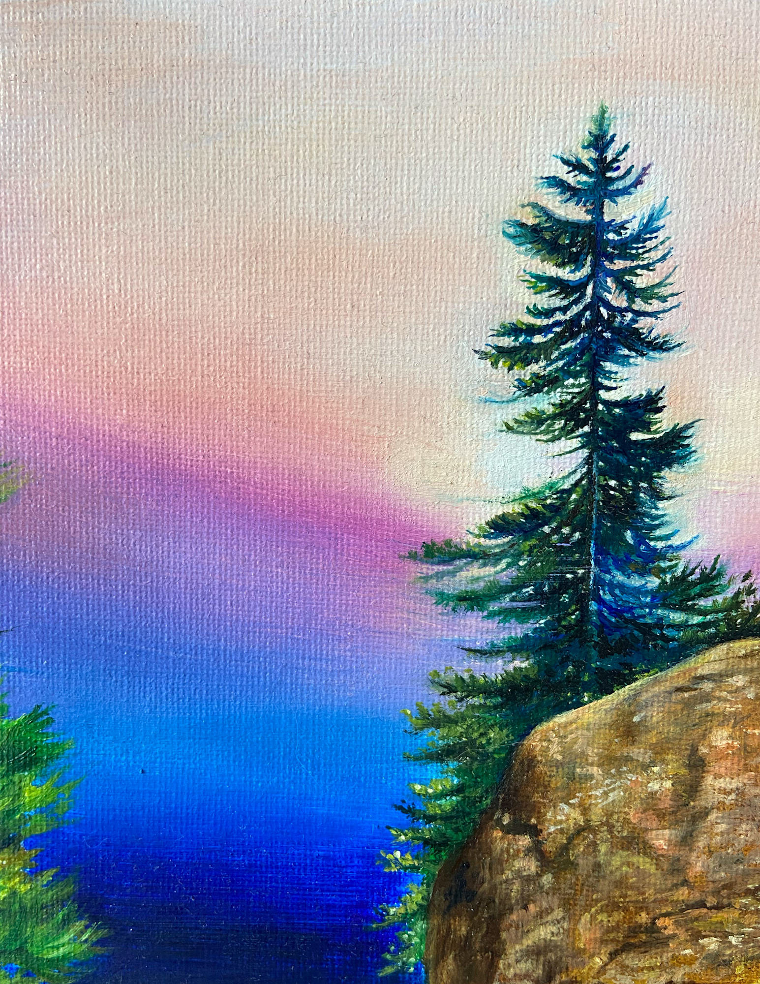I have depicted the rocks in a setting illuminated by a mysterious evening sun, casting an enchanting glow that enhances the sense of wonder and secrecy within the landscape. The unique shapes of the rocks inspired this artwork, capturing not only their natural beauty but also the awe and mystique they evoke.