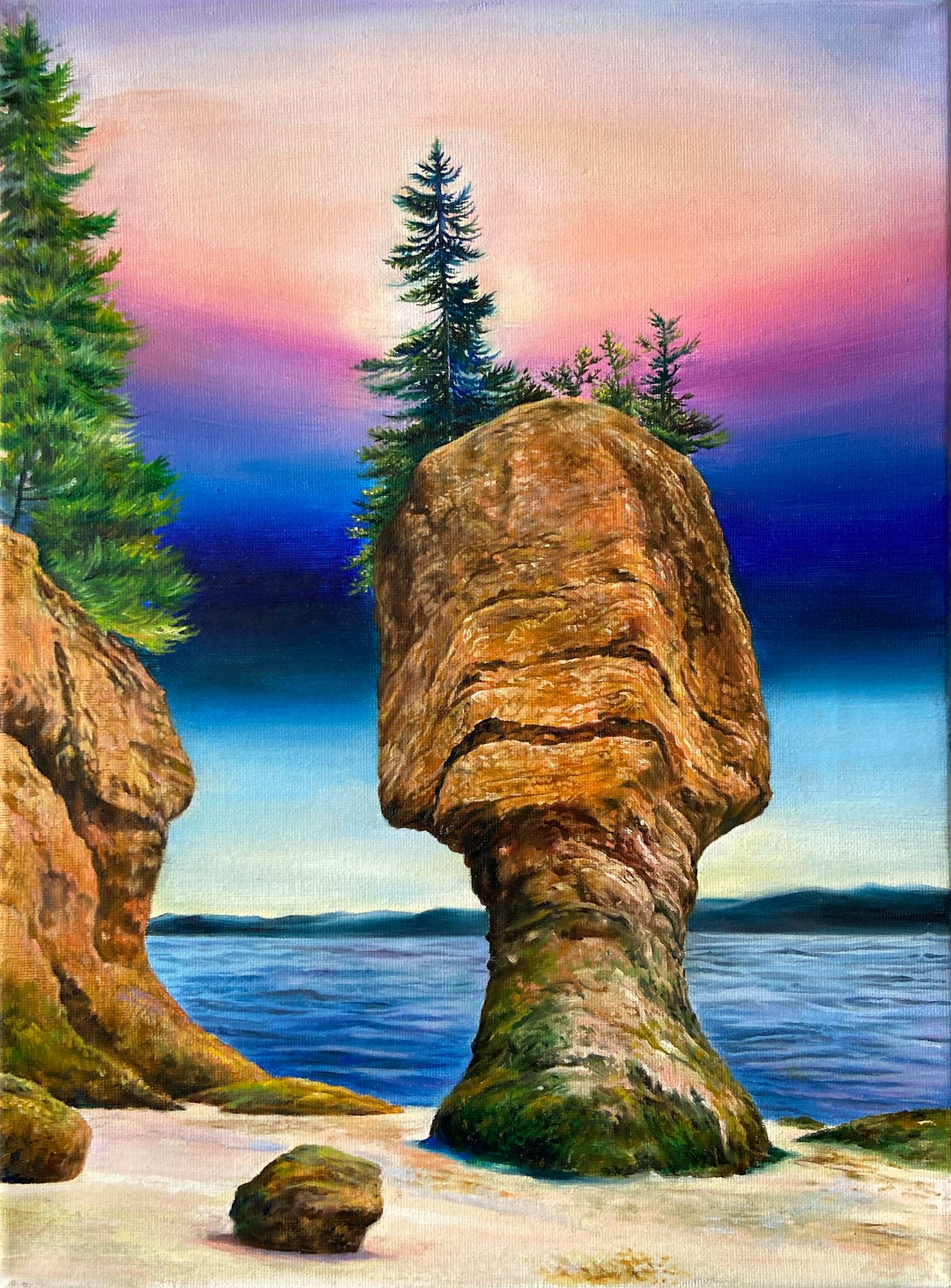 My painting showcases the Hopewell Rocks, located in Hopewell Rocks Provincial Park, New Brunswick, Canada. These remarkable sea stacks are a testament to the incredible power of nature. Sculpted over thousands of years by the extreme tides of the Bay of Fundy, these distinctive sandstone formations resemble sculptures of human heads, giving the scene an almost mystical quality.