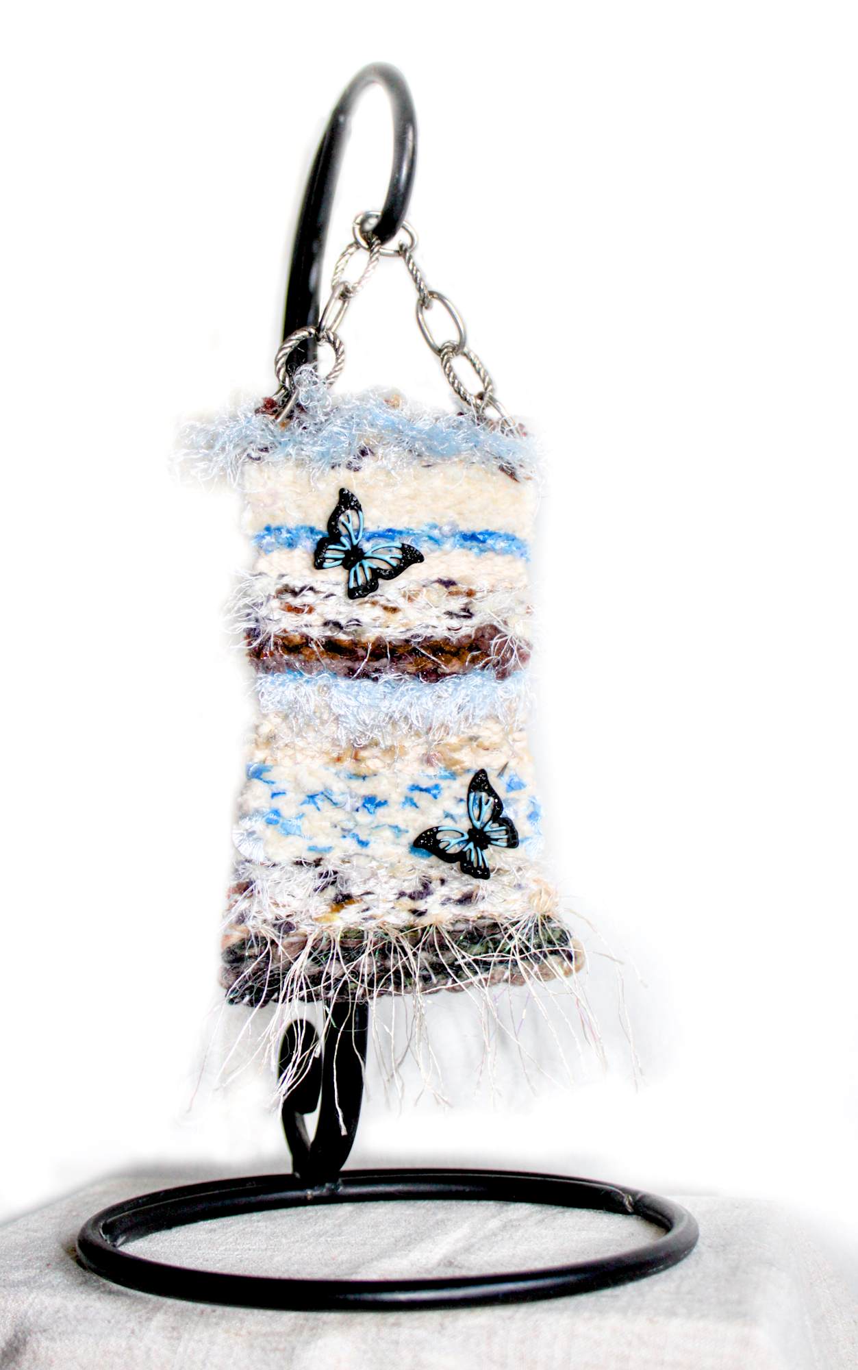 Butterfly flutters through your life bringing personal growth and new beginnings. Showcased is a blue butterfly that often peace and tranquility. This mini tapestry contains silky soft blue eyelash, unique string yarn, blue flag string, ribbon, soft chenille, silky angel fur yarns and more unique found fibers. A favorite, each butterfly sparkles to make this a healing piece of artistry. Showcased on a metal ornament hanger, not included with your tapestry artwork.