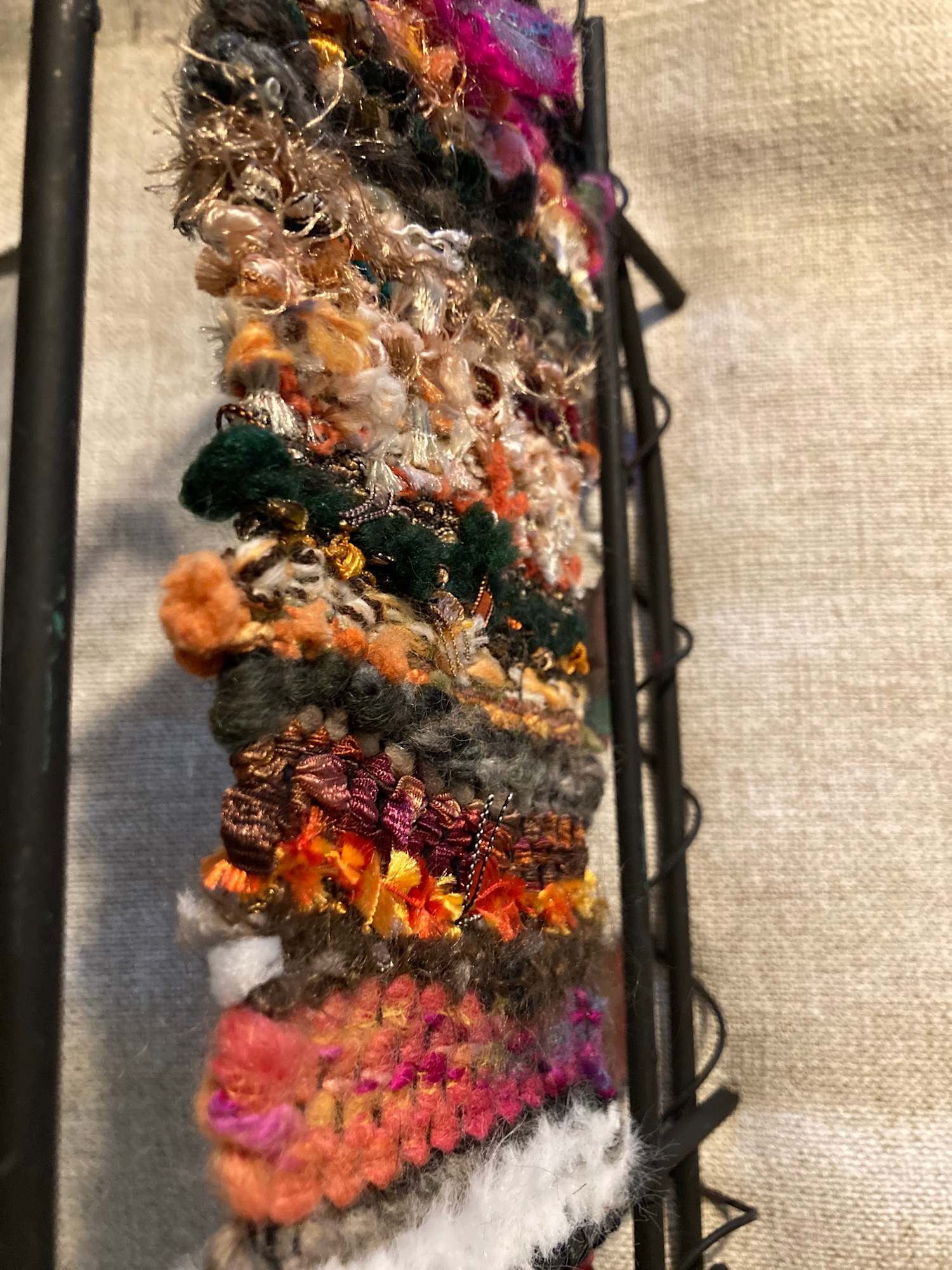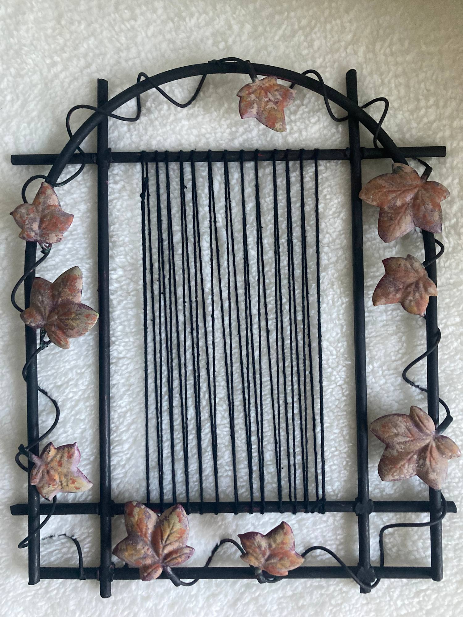 This first of it's kind small tapestry is framed by repurposed metal found at a thrift that supports intellectual & developmental community. After removing broken pieces & sharp metal points, it received a makeover with freshly painted accent leaves. Tapestry was created within the metal frame (first time I created on like this). Bold colors highlights the frame, the landscape created by a variety of vintage repurposed fibers adds to the appeal.
