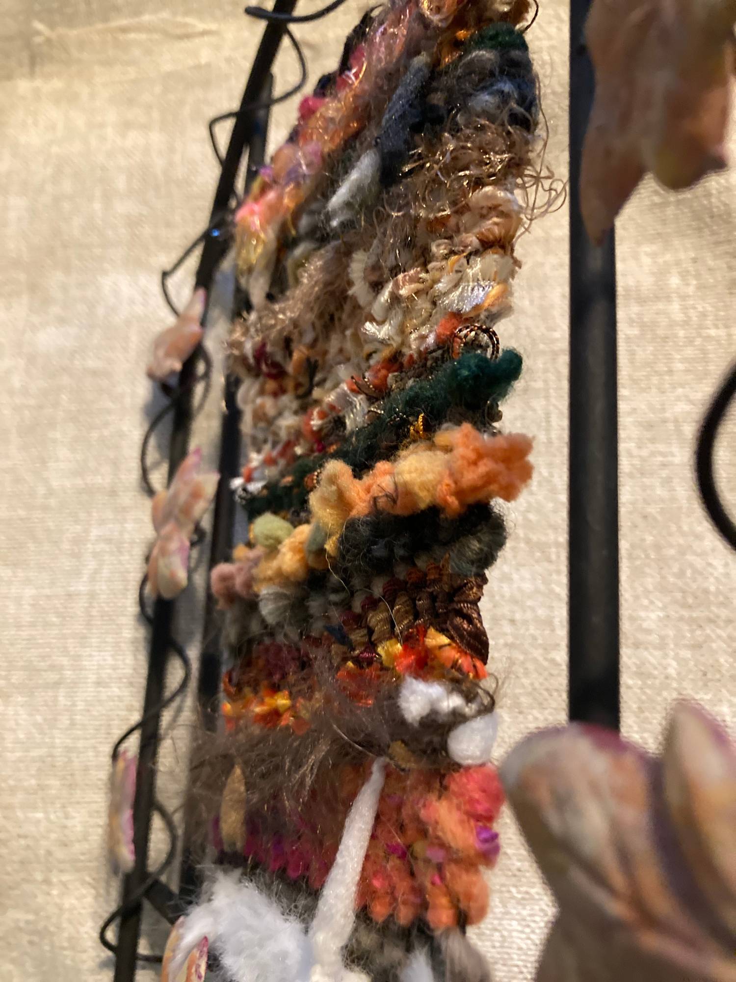 One of a kind artisan made from repurposed vintage fibers and found jewelry treasures from a local thrift that enhances the lives of those with intellectual and developmental challenges to thrive and live their best lives. Each tapestry is designed and created to showcase pieces of jewelry, colors and textures of these sometimes irreplaceable fibers that can include linen, cotton, soft feather, string, one of a kind fibers, chenille, anything I can salvage or find discarded. You just never know what I will piece into a tapestry.