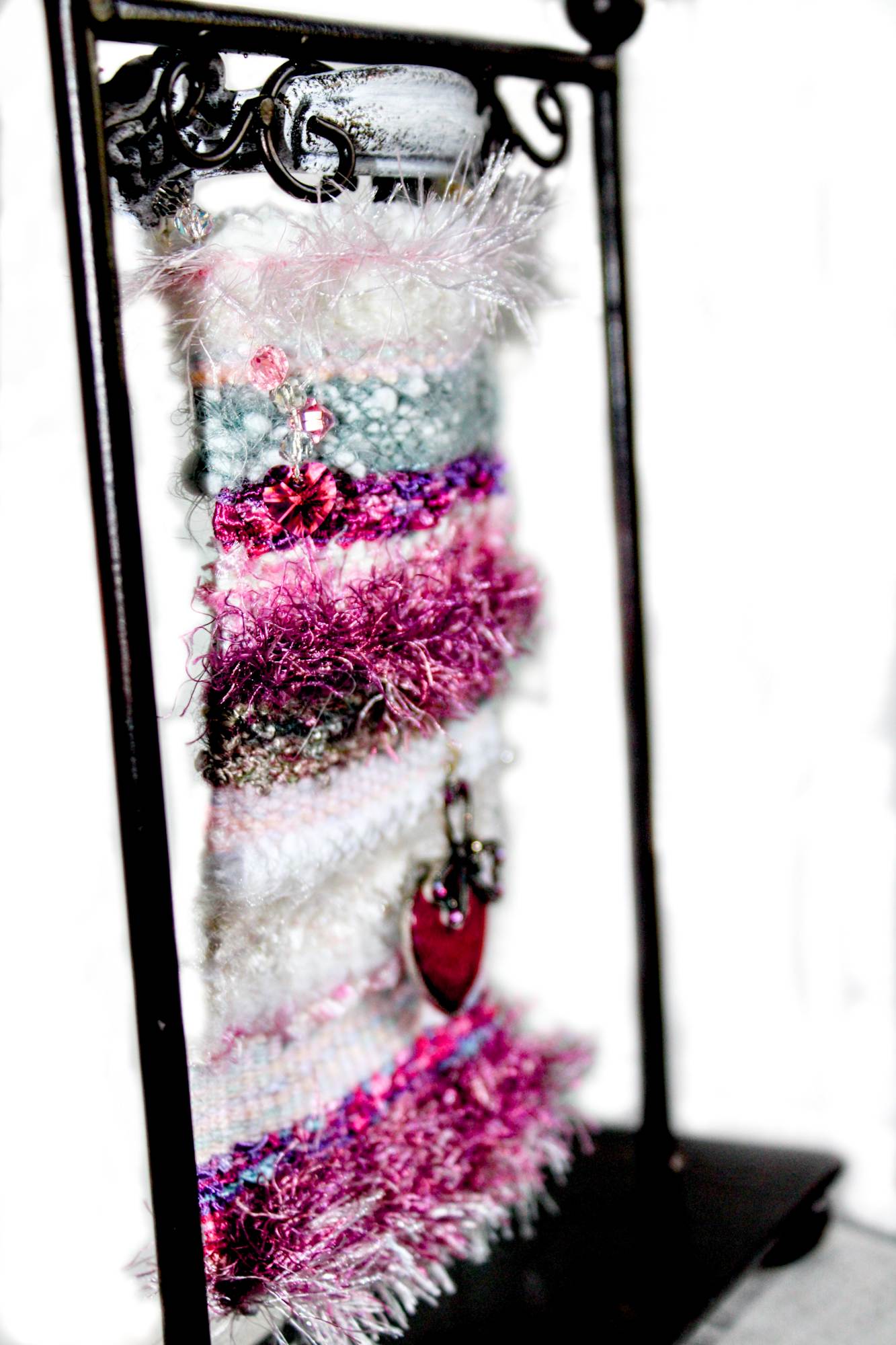 Fiber Art Creations using repurposed fiber & jewelry, found treasures from a non profit that supports the developmentally & intellectually challenged, to create a new mini tapestry wall hanging. Support a cause with your purchase of Artwork created in the USA.