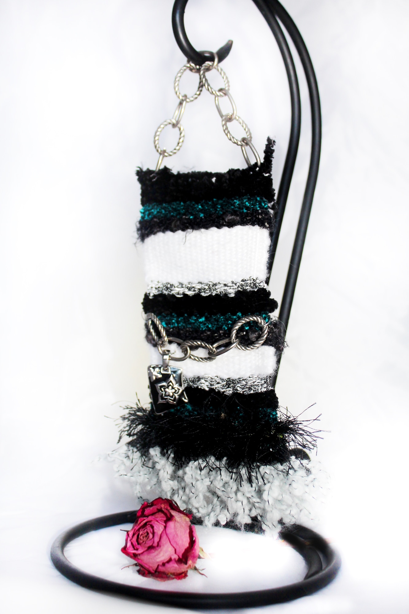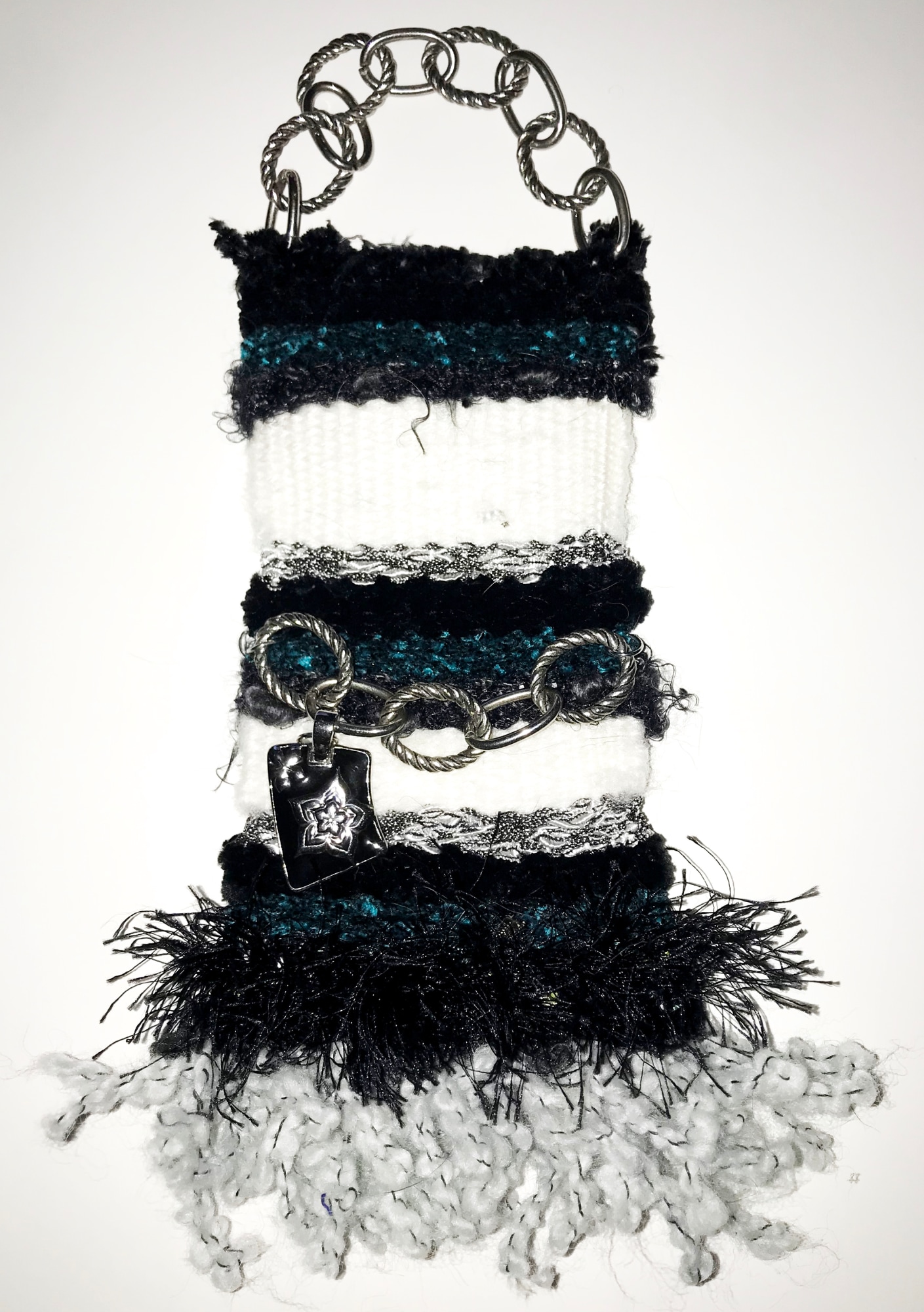 These creative pieces are hand woven on an old fashion metal loom. Yarns are a variety of material, mostly unique one of a kind. Many will have yarns of cotton, wool, linen, mohair, faux furs, string yarns, flag yarn, ladder, ribbon, silks, rayon, polyester, velvet, chenille and anything unusual. Everything goes through a rigorous cleaning, winding into a ball, color sorted and showcase unusual yarns to become the centerpiece of a new tapestry. Jewelry pieces are found treasures that often are the inspiration for the tapestry. You may find a bracelet, pieces of jewelry taken apart and reworked, pin or a whimsical accent all of high grade vintage jewelry. Items are cleaned with alcohol and refurbished to sparkle and enliven these works of art. Many will often have swarvski crystals added into these works of art. Hanger is A large metal link necklace (recommend using a decorative nail to hang as shown - these are not included) that finishes the artwork for unique display.