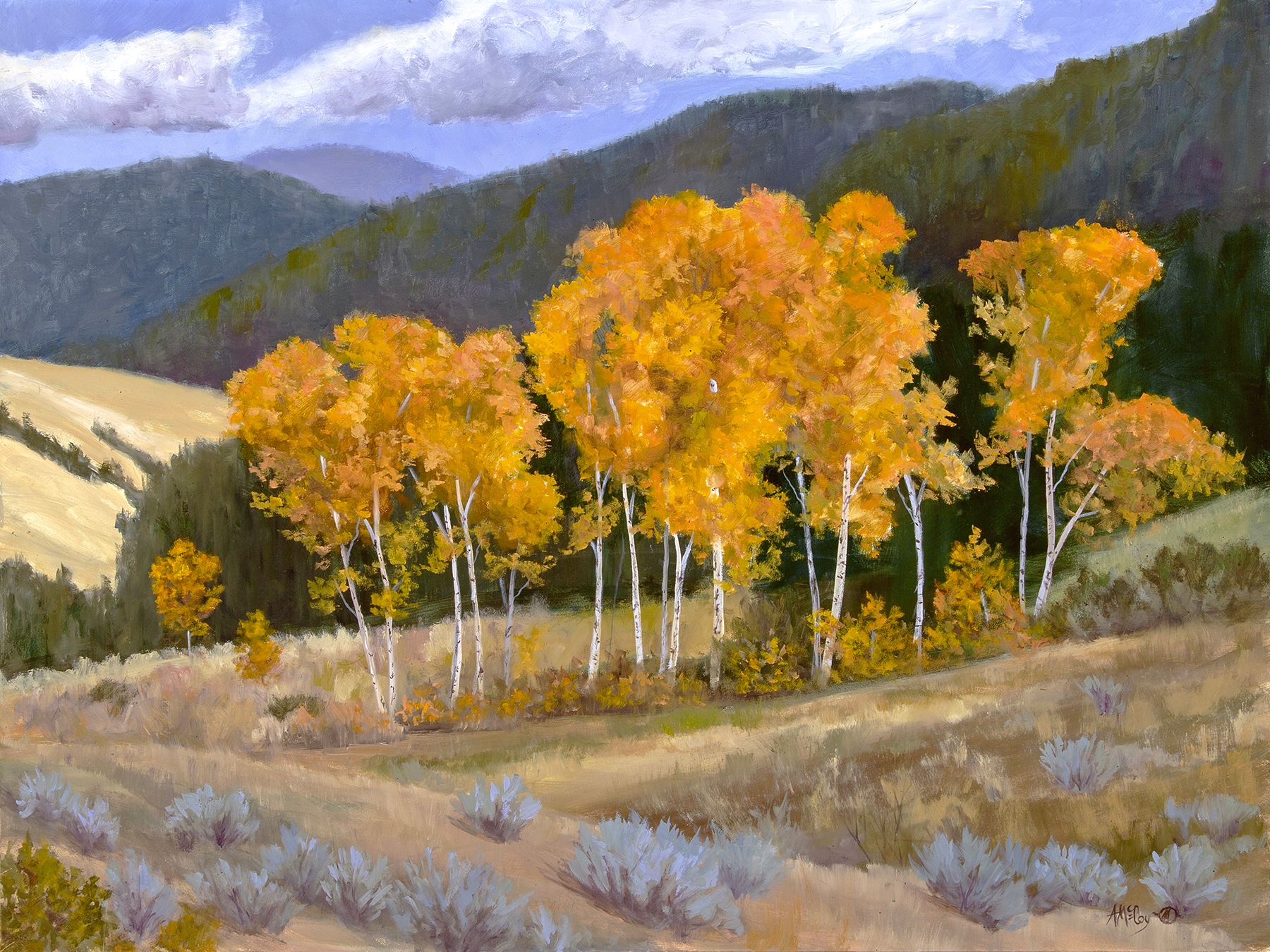 On the hillside above Bear Creek near Big Sky, MT, the aspens are glorious in the fall. I painted this plein air along with a good painting friend one late September afternoon, but did the finishing touches as soon as back in the studio.