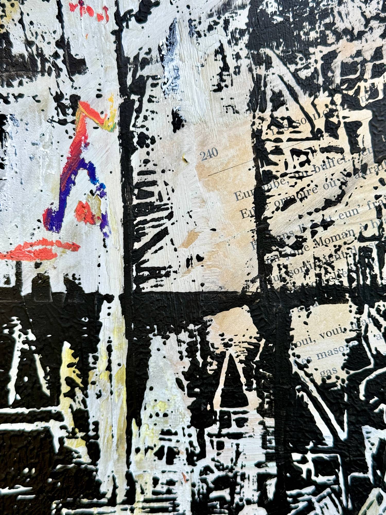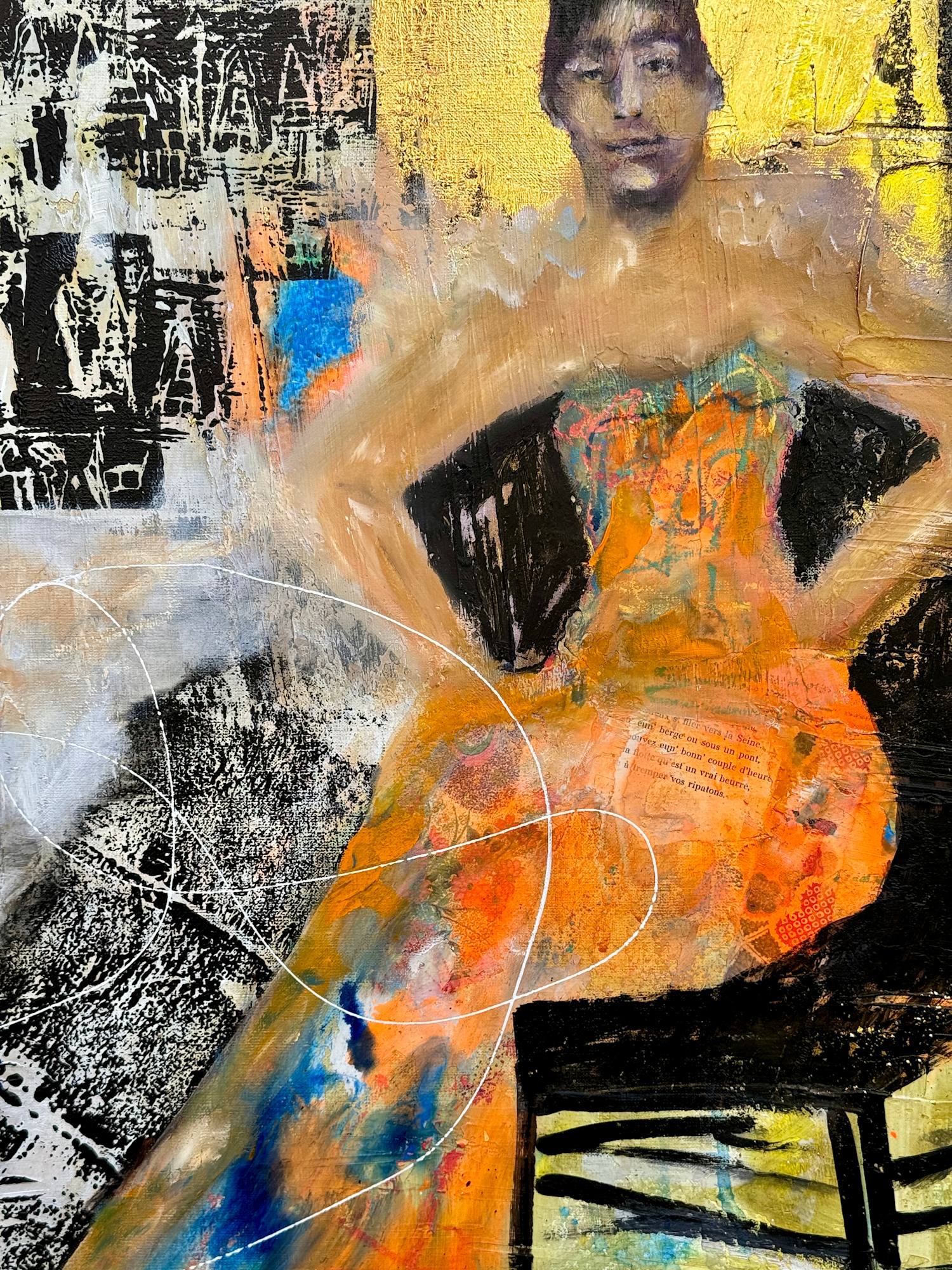 I also used acrylic paint, inks, artist crayons, pens, charcoal, gold leaf, oil pastels, oil sticks and oil paint. And some collage, including a page from a French book I found at Hogan Hero Star, Robert Clary's estate sale in Beverly Hills.
