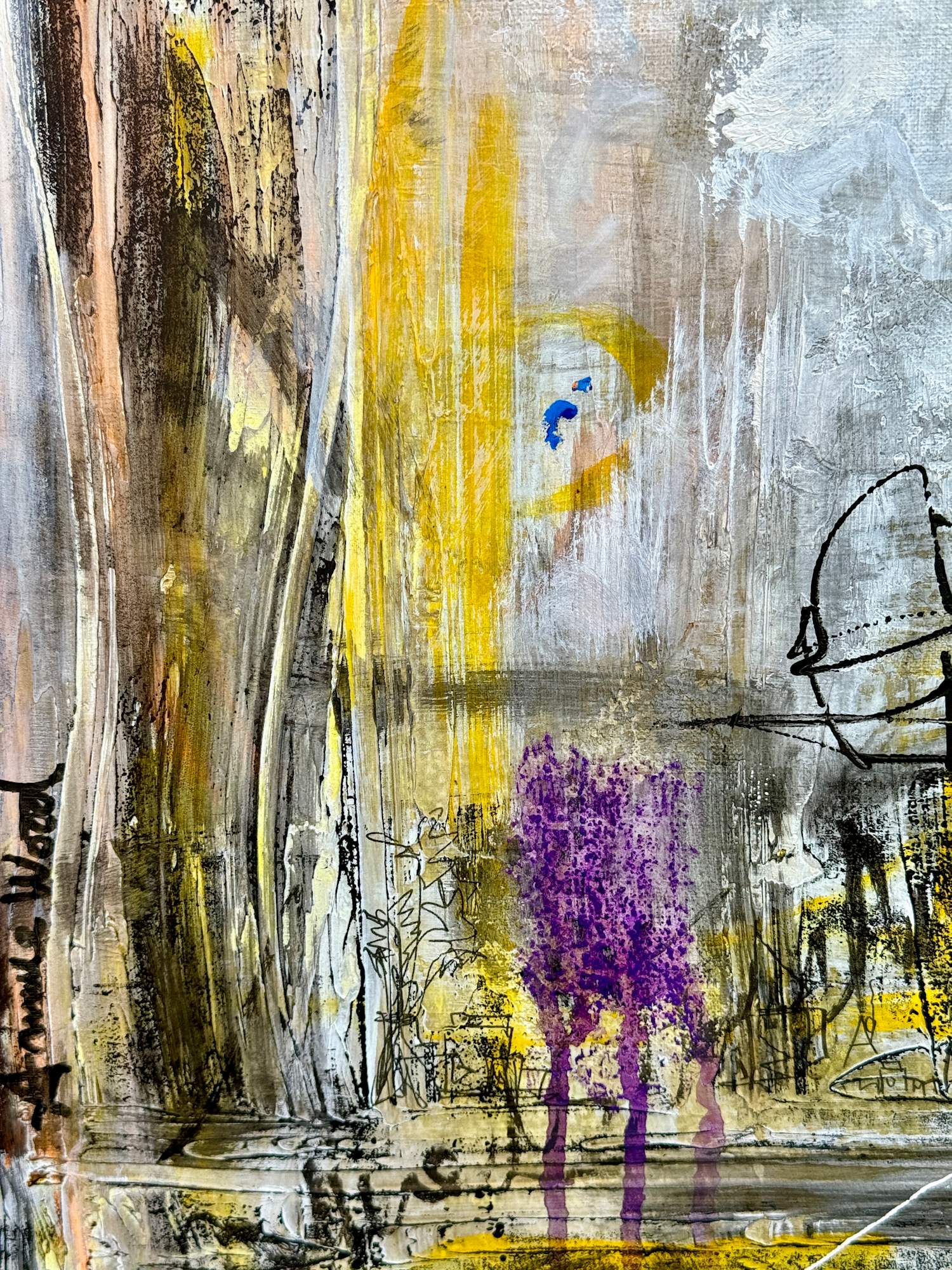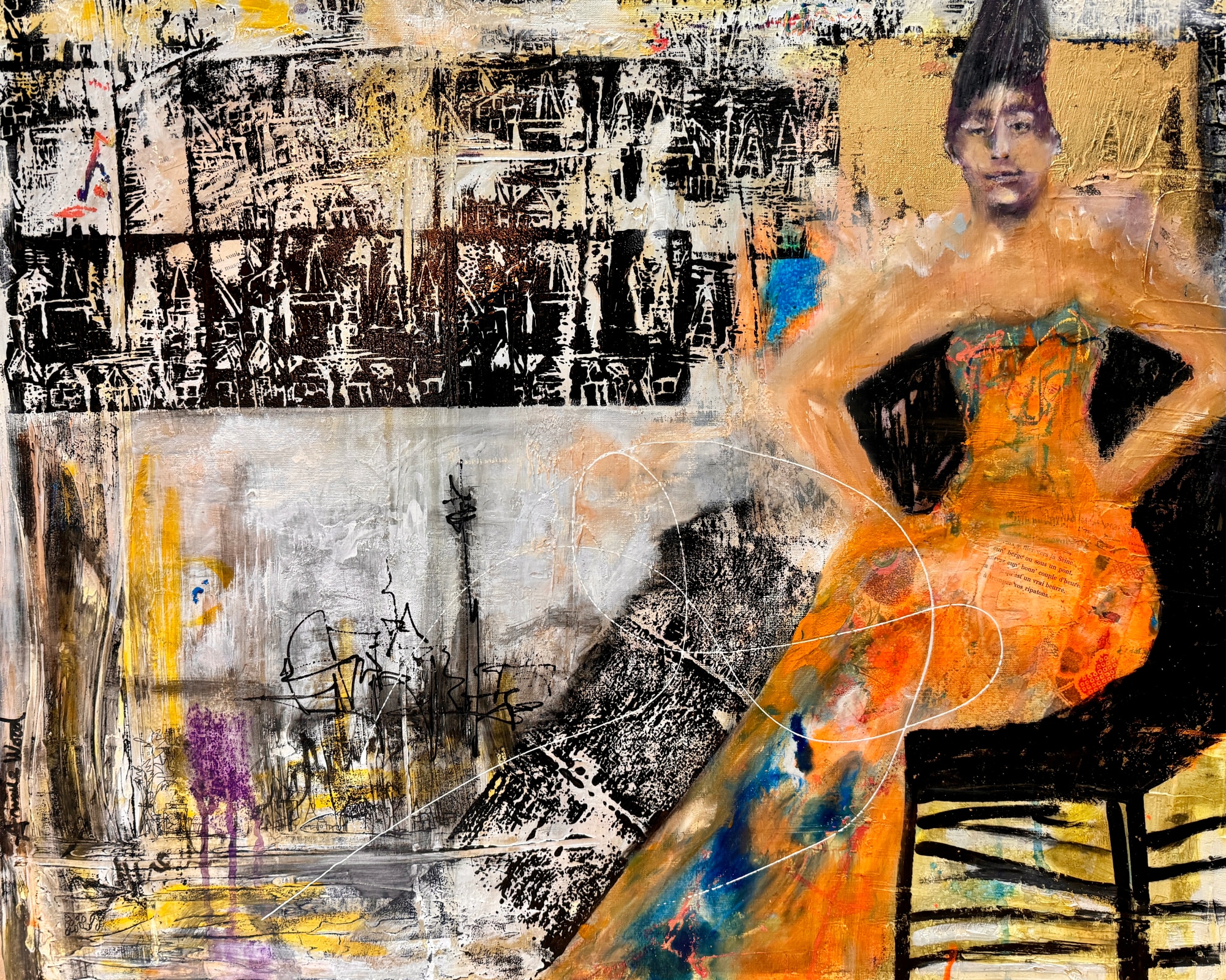 For this piece I chose to work on linen on canvas. I used several layers to create texture and depth. I wanted to incorporate my love of printmaking so I drew a cityscape into a block and carved it, inked it, and used it in the background.