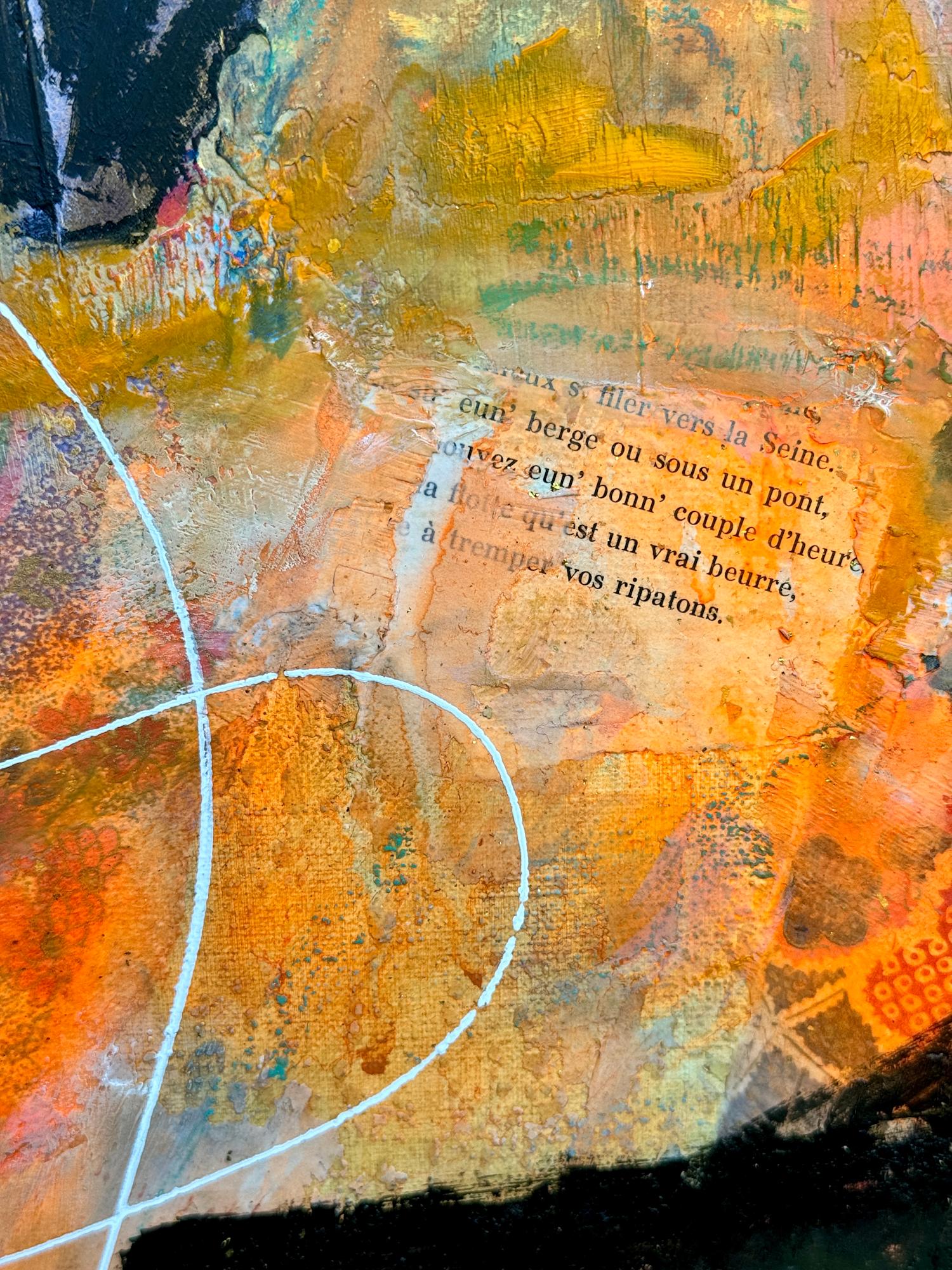 I also used acrylic paint, inks, artist crayons, pens, charcoal, gold leaf, oil pastels, oil sticks and oil paint. And some collage, including a page from a French book I found at Hogan Hero Star, Robert Clary's estate sale in Beverly Hills.