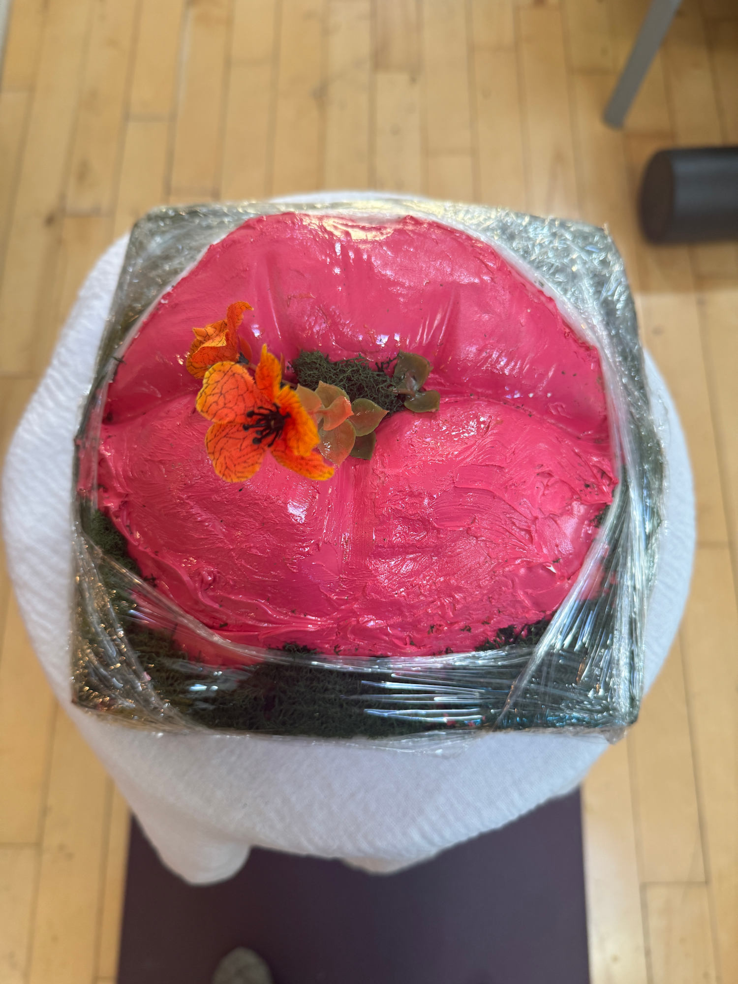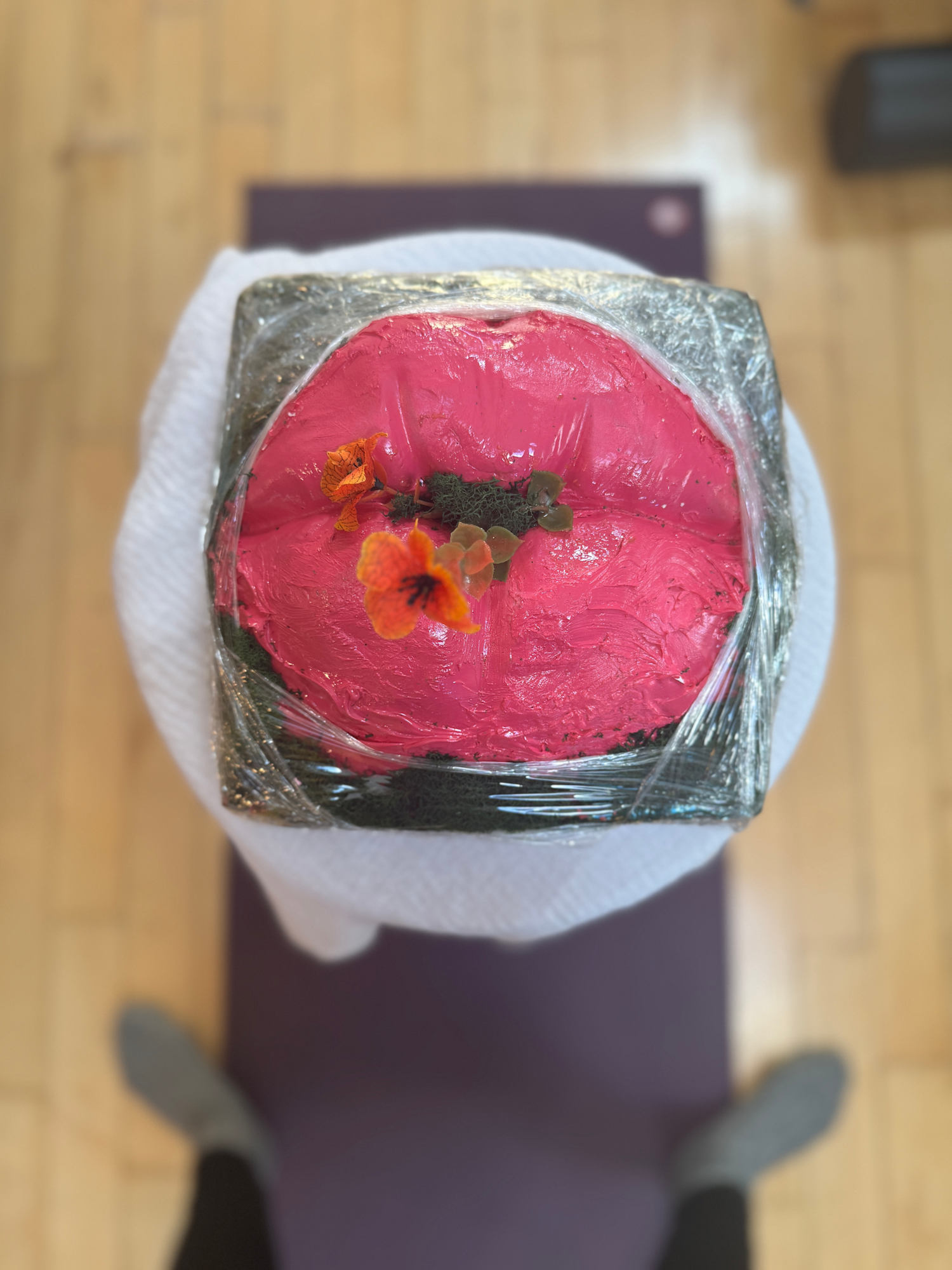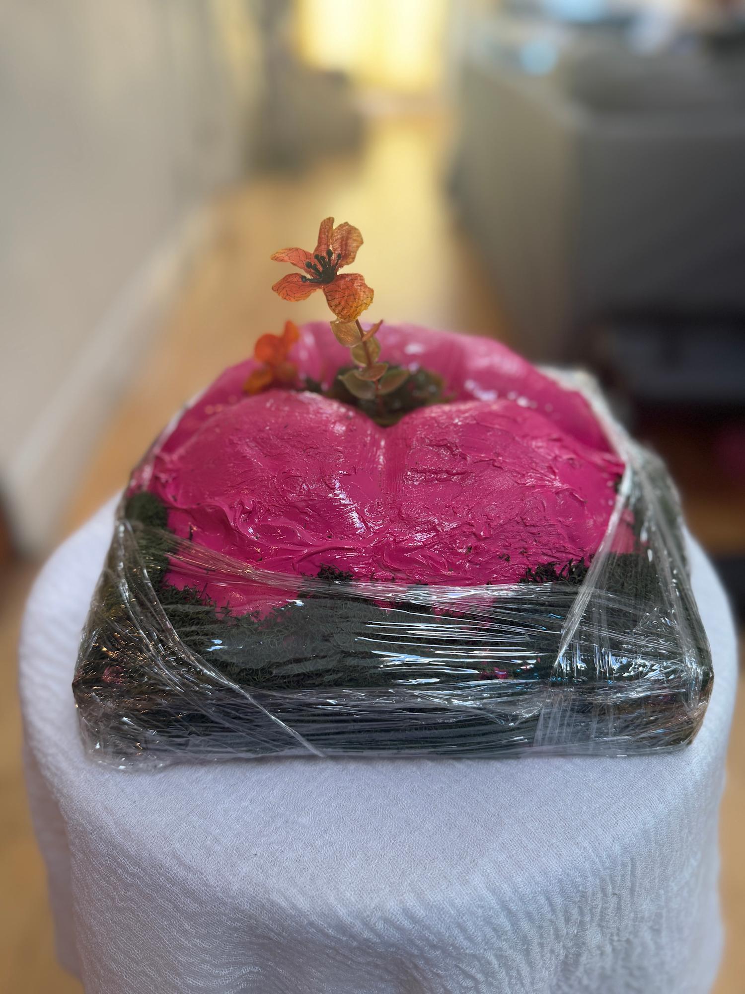 A celebration of unstoppable expression and the wild resilience of becoming, Bloom Breaks Through captures the moment when what’s hidden refuses to stay contained. The bold, unapologetic lips—sealed but never silenced—hold within them the vibrant force of life pushing forward. Encased in a fragile layer of cellophane, the piece asks: How long can we hold back what’s meant to grow?