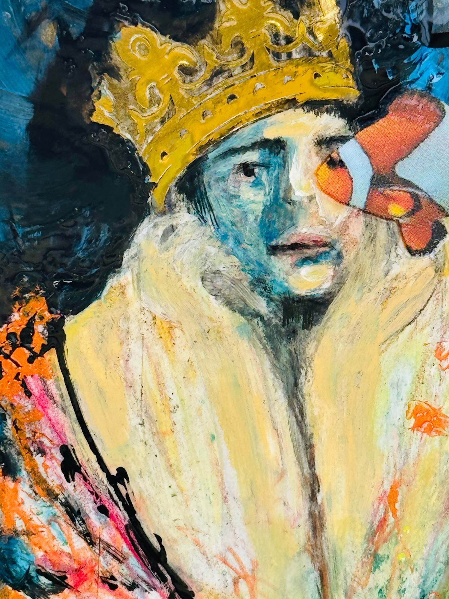 This artwork features a figure cloaked in regal attire, crowned with a golden diadem that symbolizes mastery over one’s own life. The figure’s face, rendered with introspective hues of blue and white, gazes directly at the viewer, conveying a silent but powerful assertion of identity.