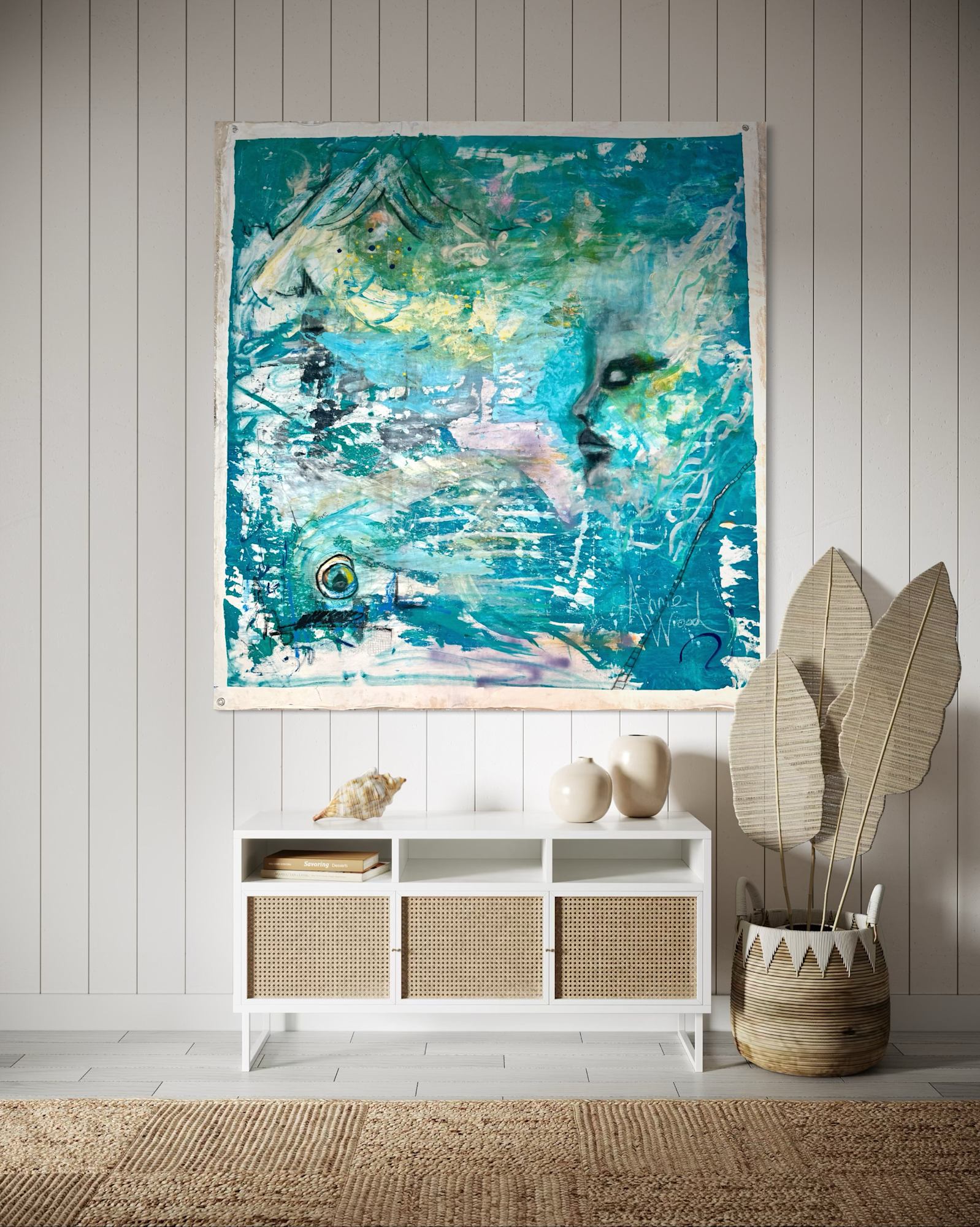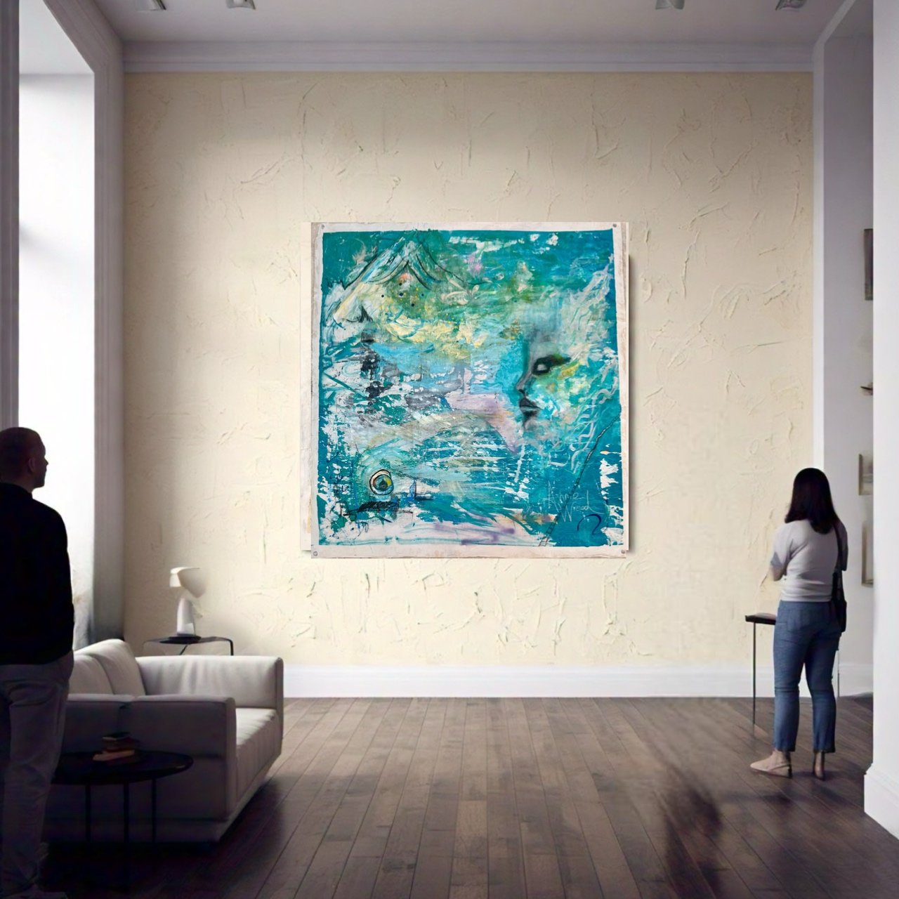 A spectral presence emerges from layered washes of teal and cerulean, dissolving into the atmospheric textures that swirl across the canvas. The interplay of translucent veils and bold gestural marks creates a sense of movement—an ebb and flow between form and dissolution. Scraped-back surfaces reveal hidden depths, while flecks of gold punctuate the composition like scattered echoes of something just beyond reach. The eye, a focal point of quiet intensity, anchors the drifting elements, hinting at a gaze both present and distant. A meditation on impermanence, energy, and the unseen, Drifting invites the viewer to step into a liminal space where past and present blur, and the spirit of the piece lingers just beyond the surface.