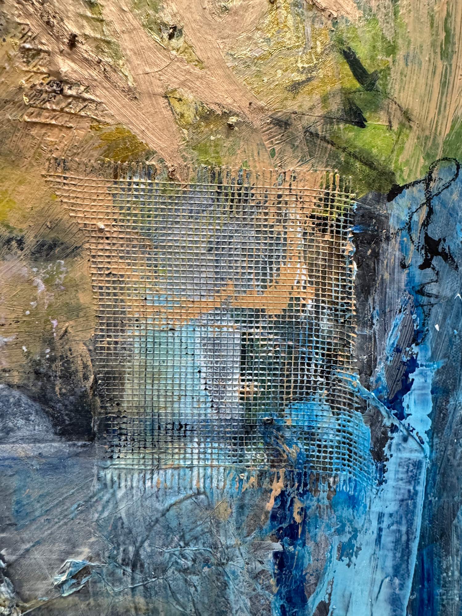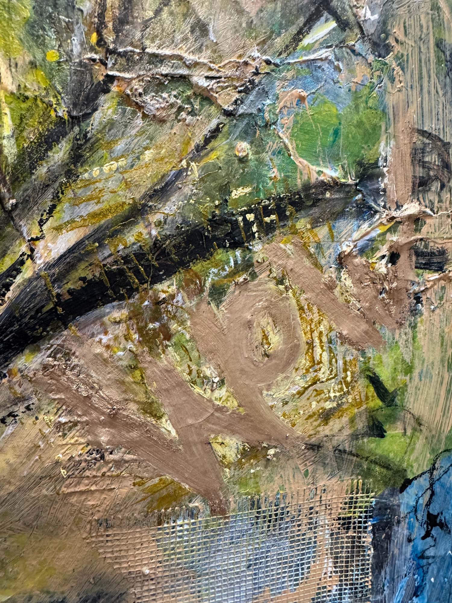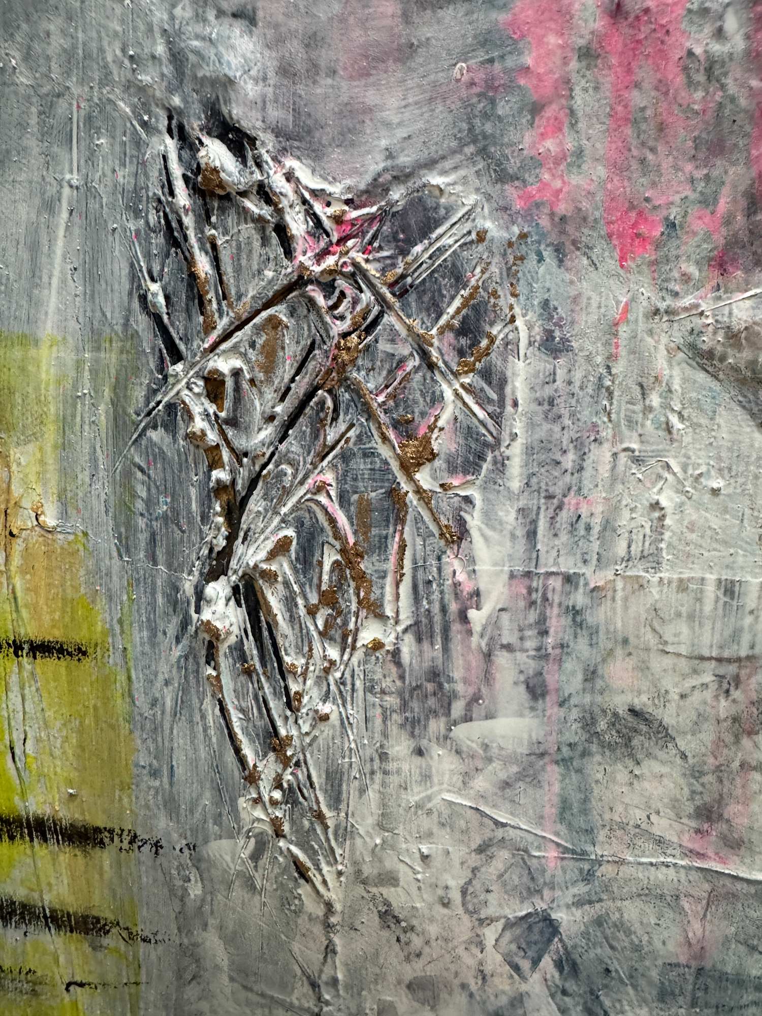 I hope viewers feel a mix of curiosity and calm — that sense of standing still long enough to notice beauty emerging from chaos. The mixed media approach allowed me to build texture and history, layering acrylic, charcoal, and gold to echo the imperfect, living energy of the natural world.