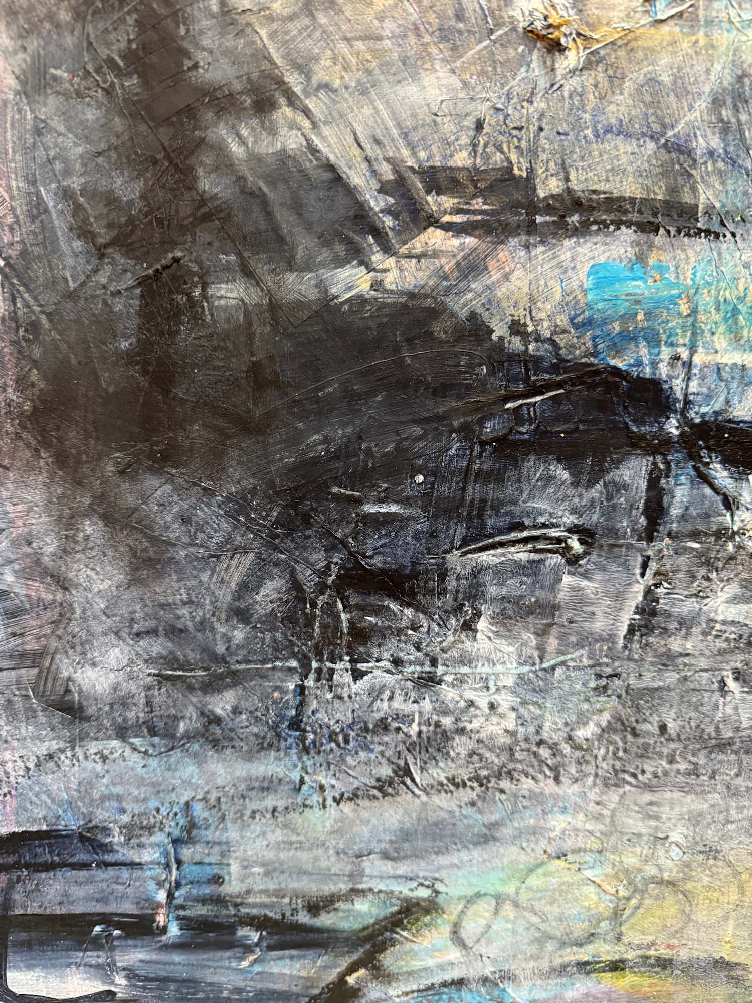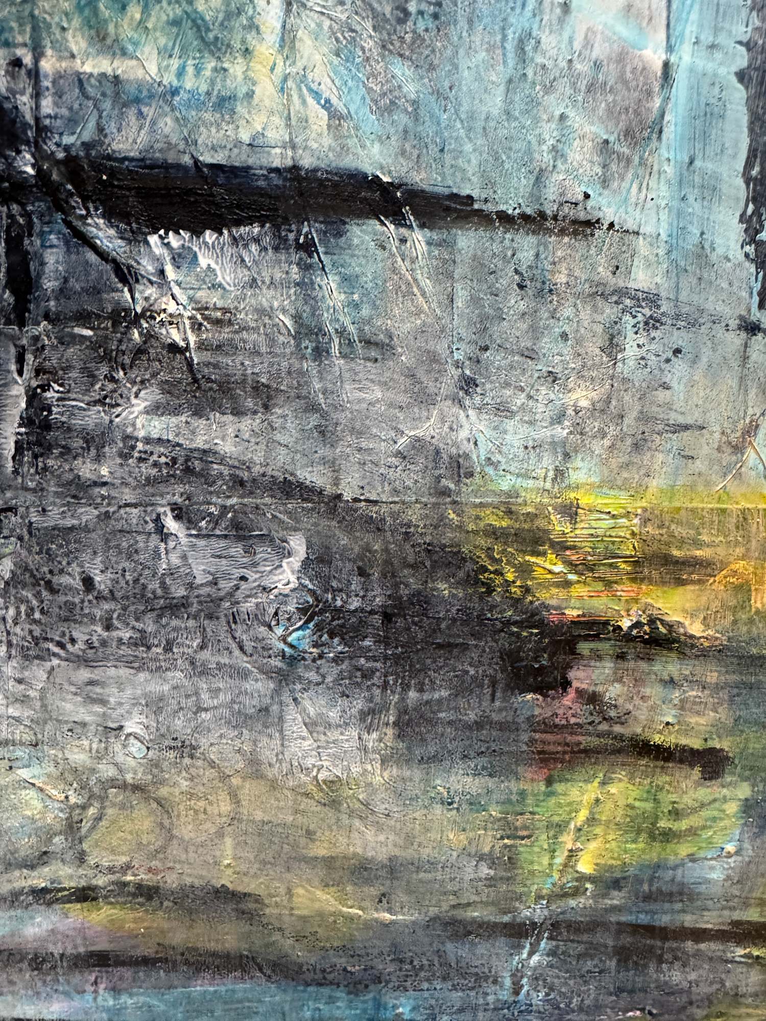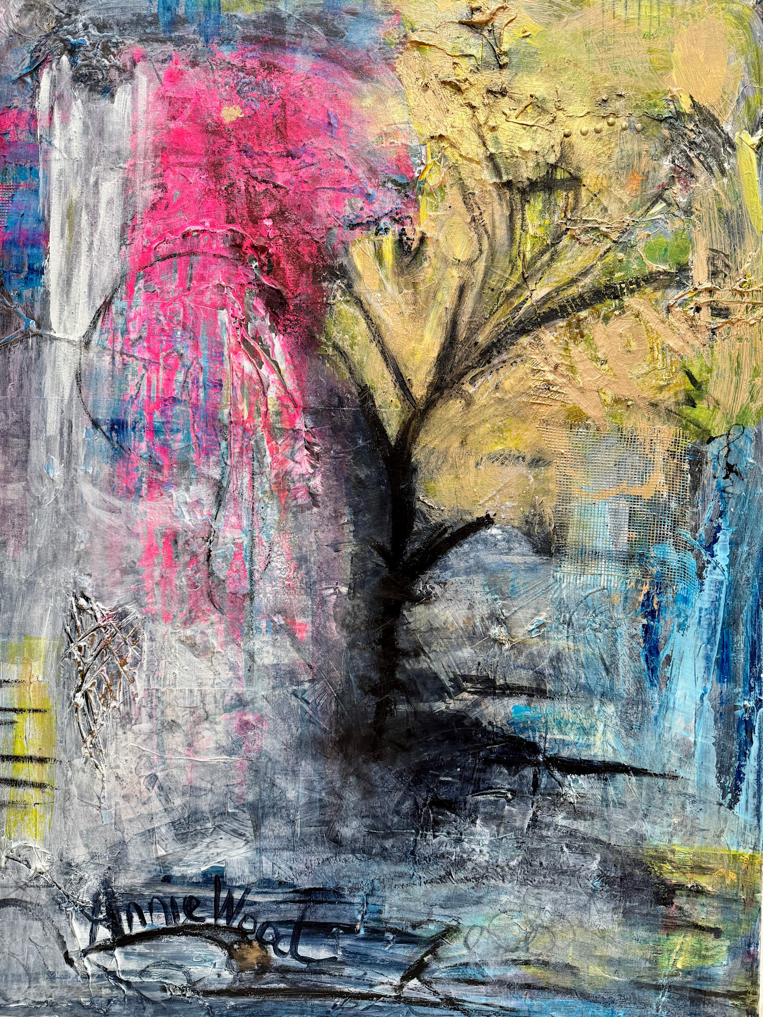 I hope viewers feel a mix of curiosity and calm — that sense of standing still long enough to notice beauty emerging from chaos. The mixed media approach allowed me to build texture and history, layering acrylic, charcoal, and gold to echo the imperfect, living energy of the natural world.