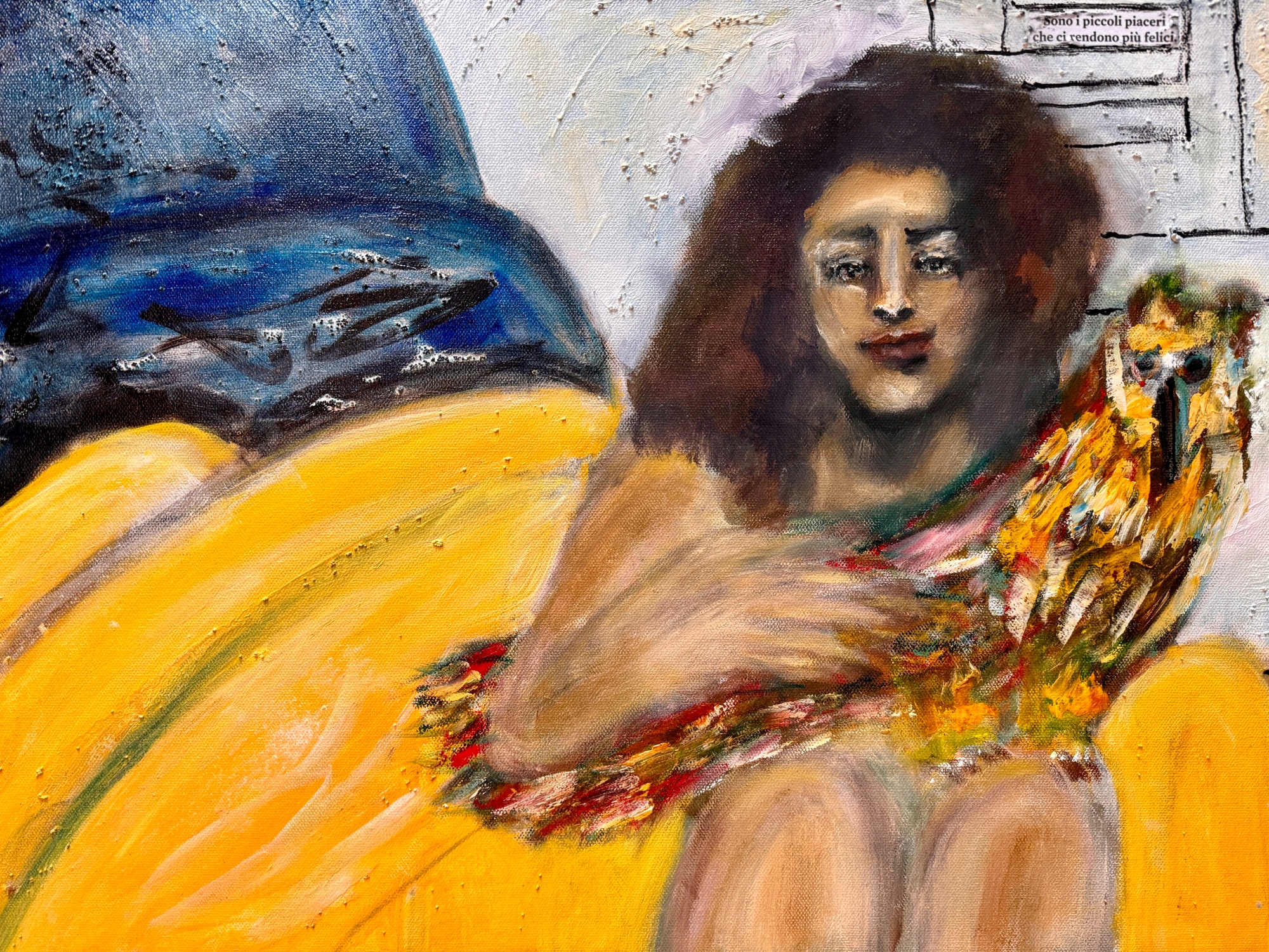 The figures dark, prominent eyes draw in the viewer, creating not just an encounter but an engagement. I used rich textures and colors to add elements of intrigue to the overall composition. The flurry of colors and wayward brush strokes give a sense of movement, vitality, and depth creating contrast with the subject's relaxed, casual pose, conveying her dynamic nature.
