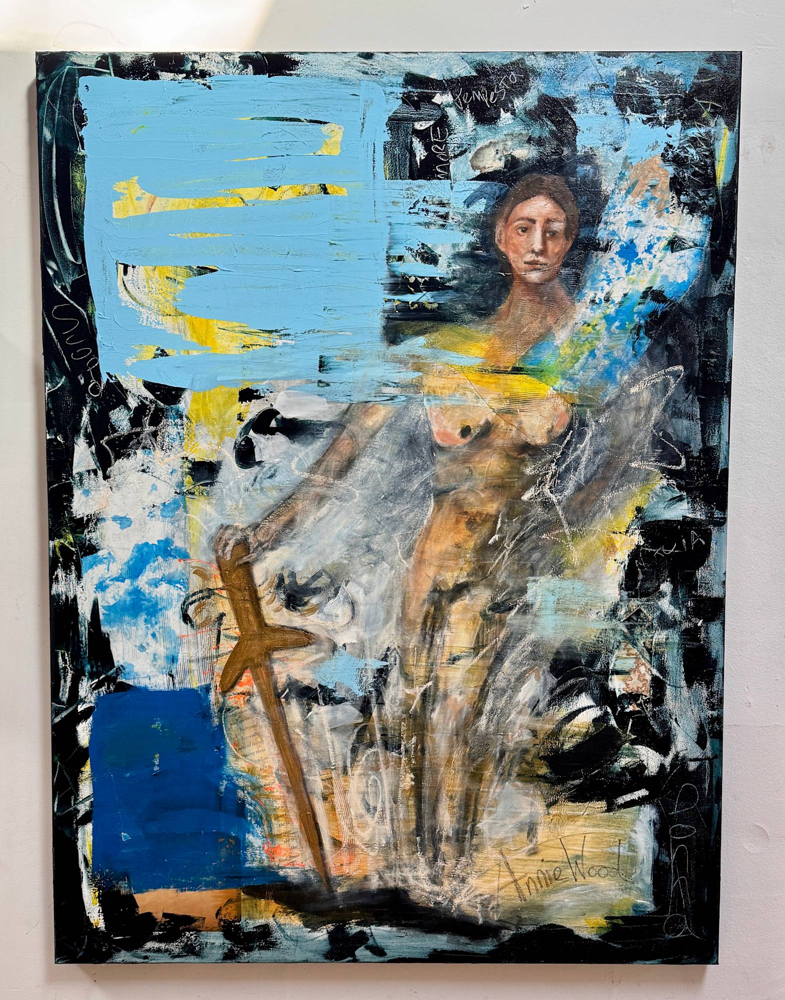 Is a bold declaration and reflection, She Is explores the space between vulnerability and power. The central figure—raw, unapologetic, and fully herself—stands grounded, leaning on a golden sword -near, etched on rice paper, are words that remind us of our own resilience. A layered, textured narrative of being a woman in the world.