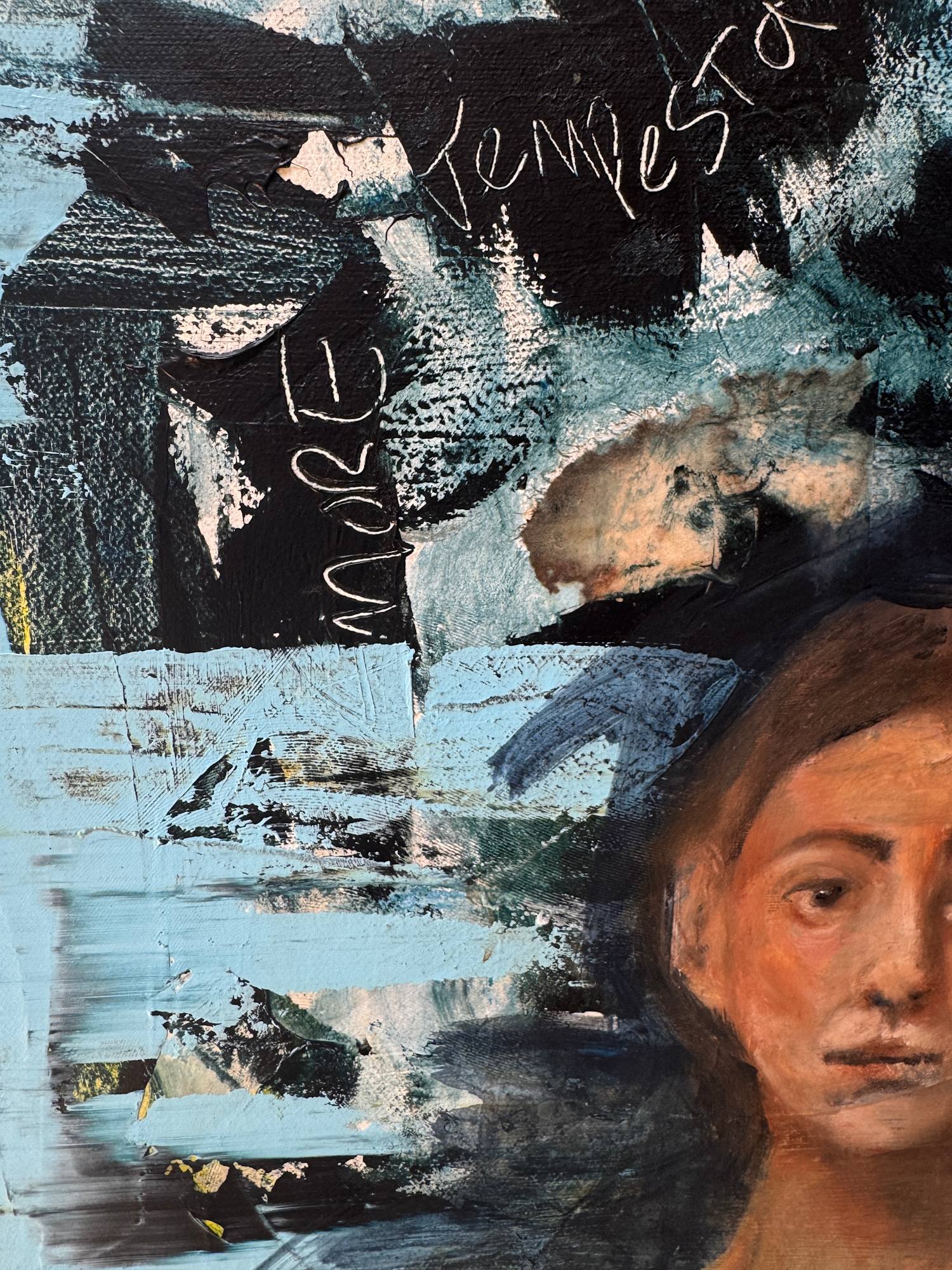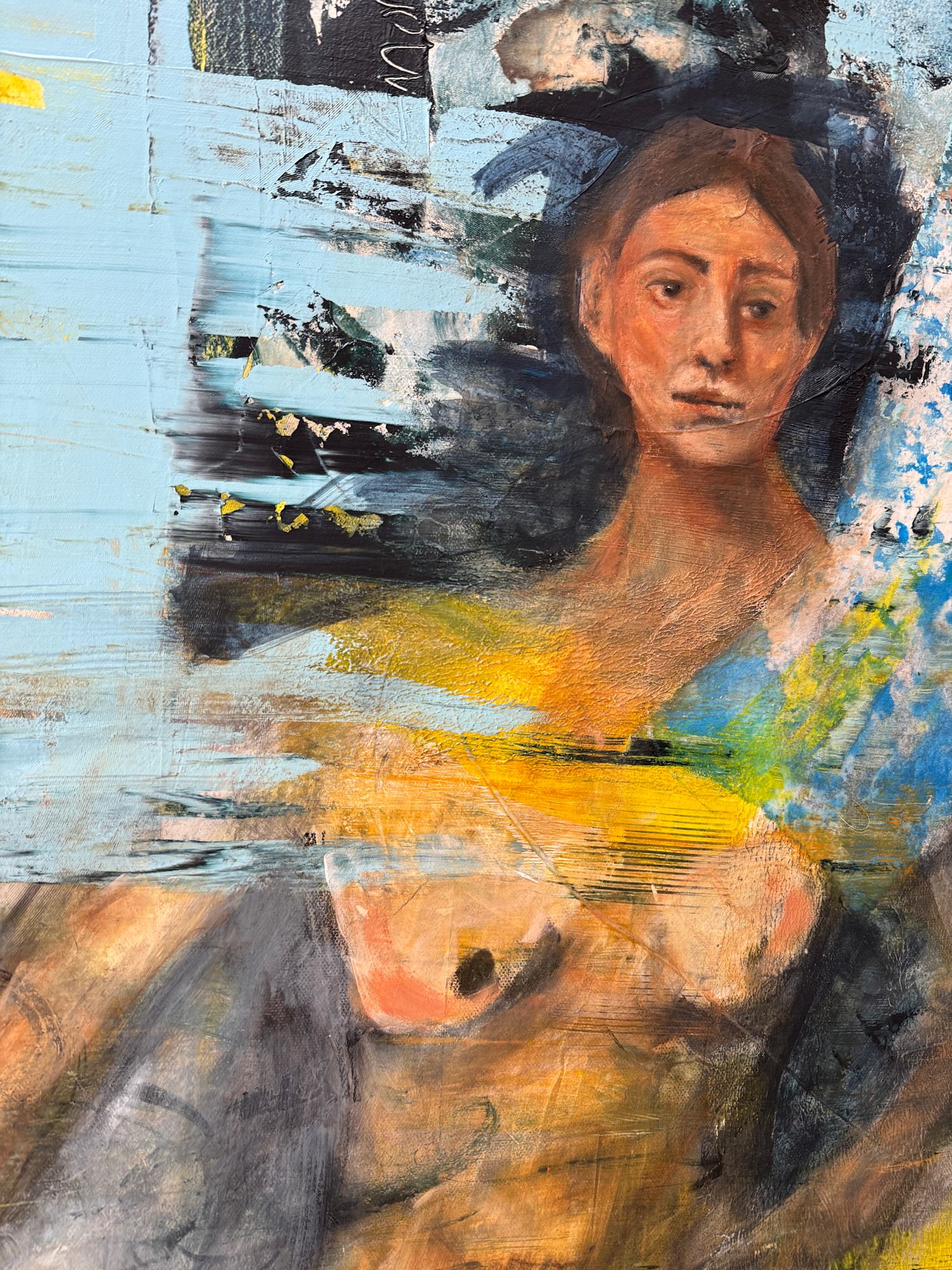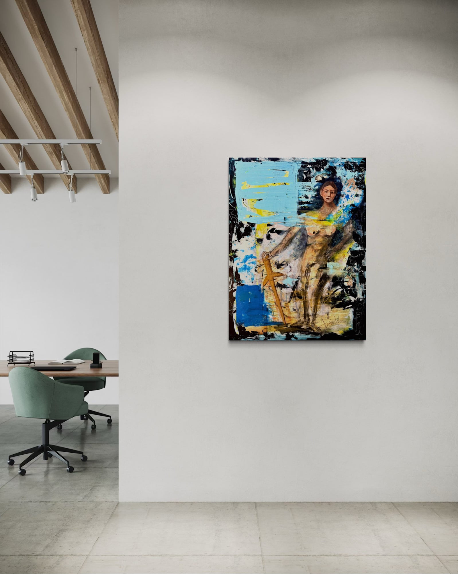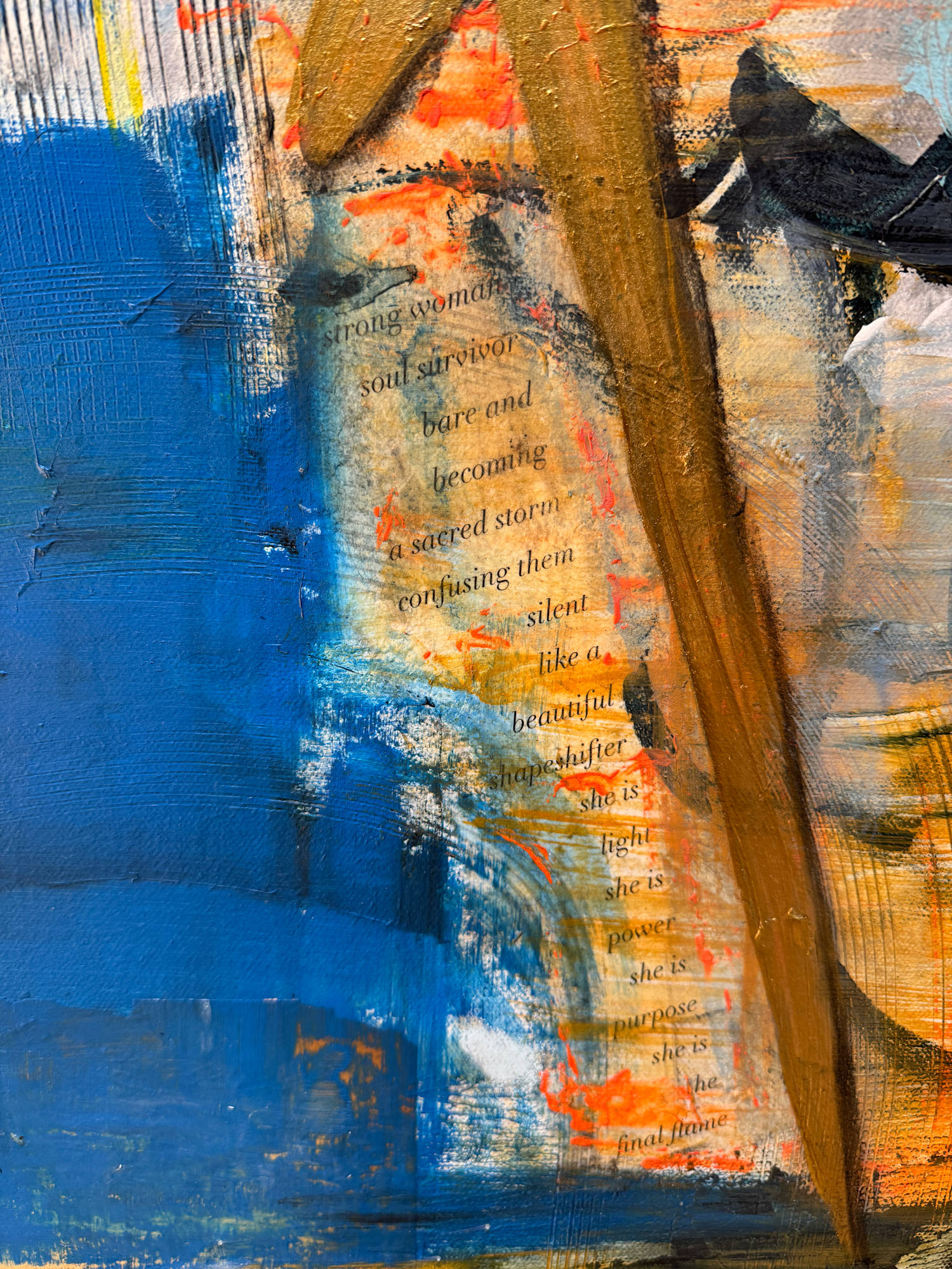 Is a bold declaration and reflection, She Is explores the space between vulnerability and power. The central figure—raw, unapologetic, and fully herself—stands grounded, leaning on a golden sword -near, etched on rice paper, are words that remind us of our own resilience. A layered, textured narrative of being a woman in the world.