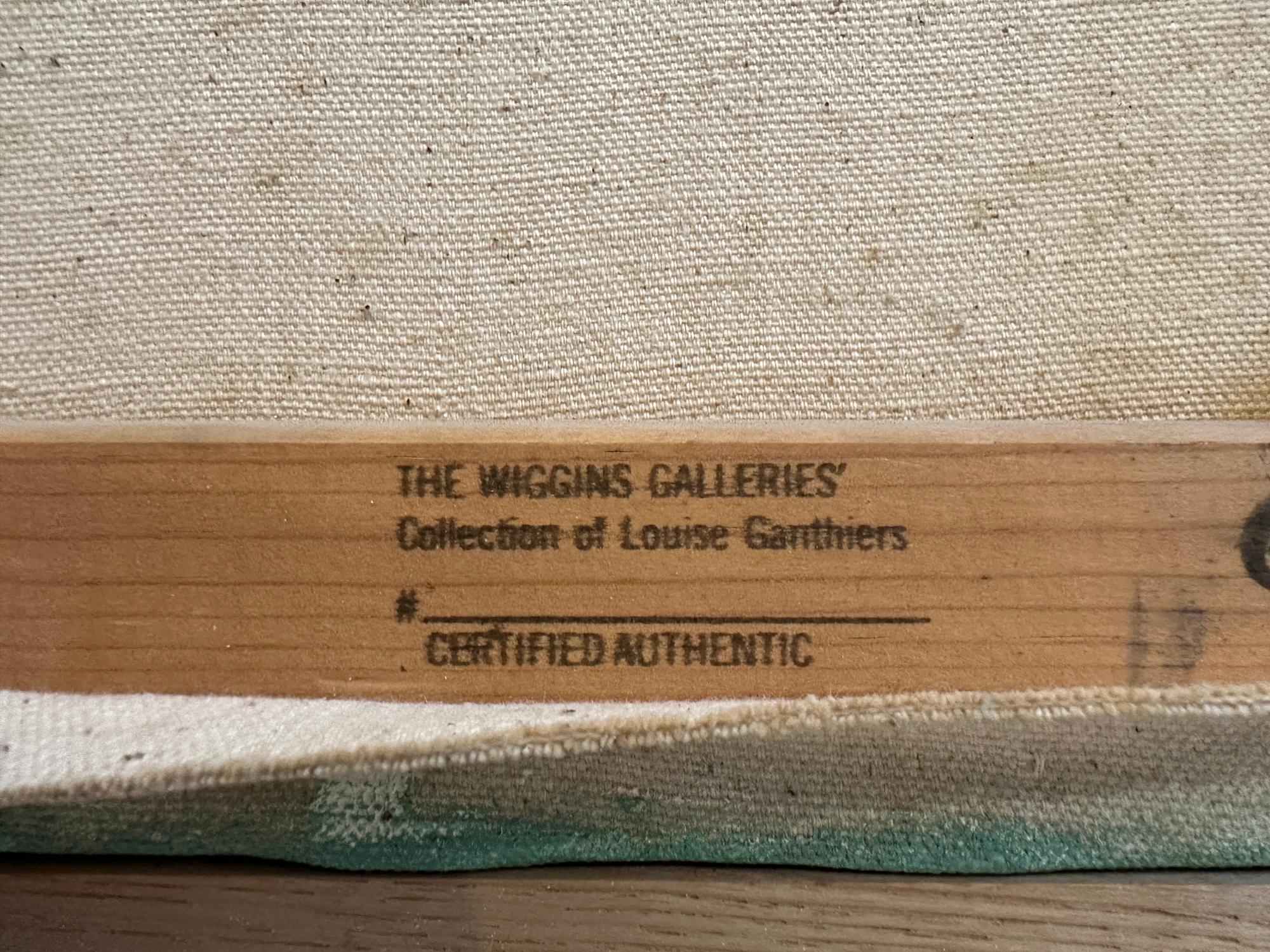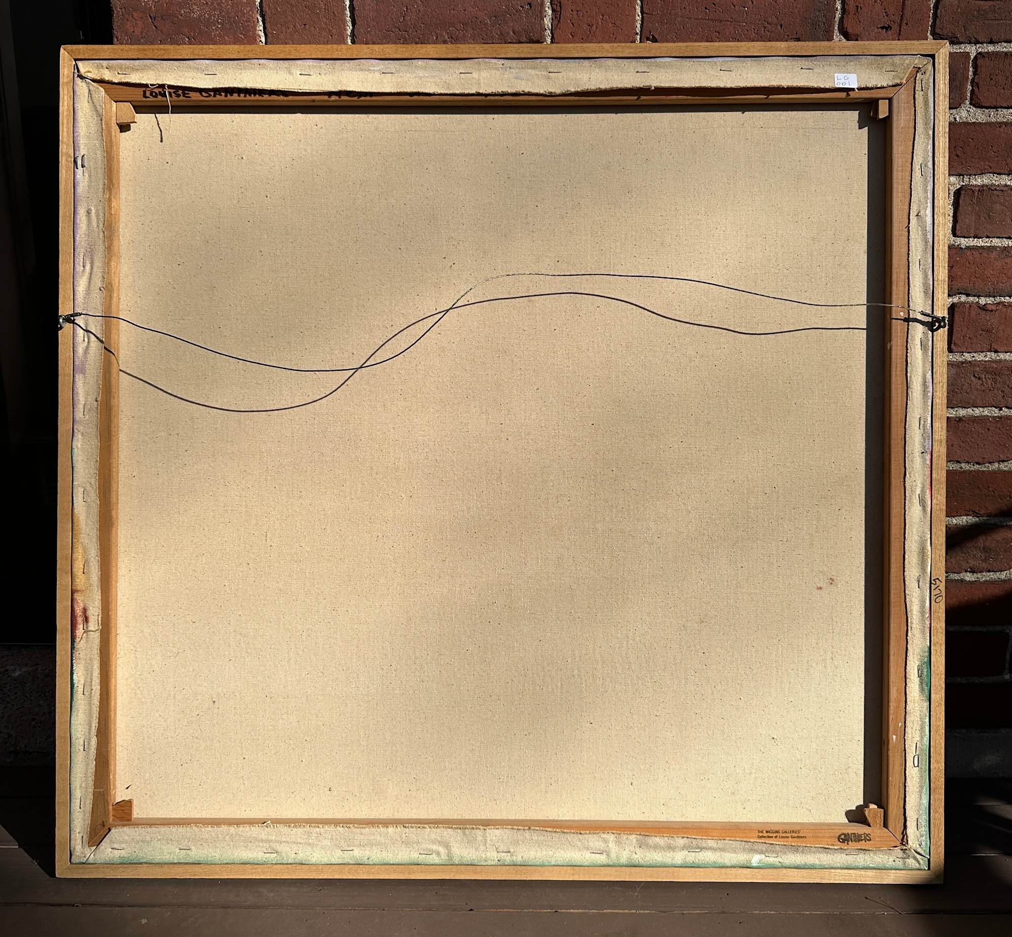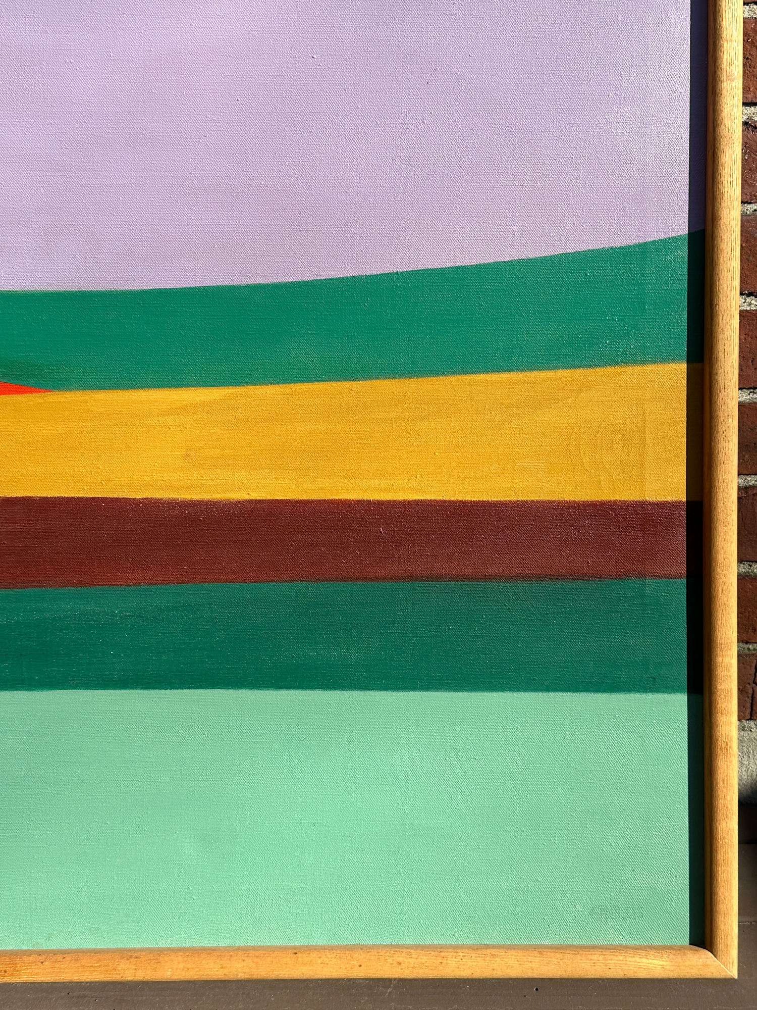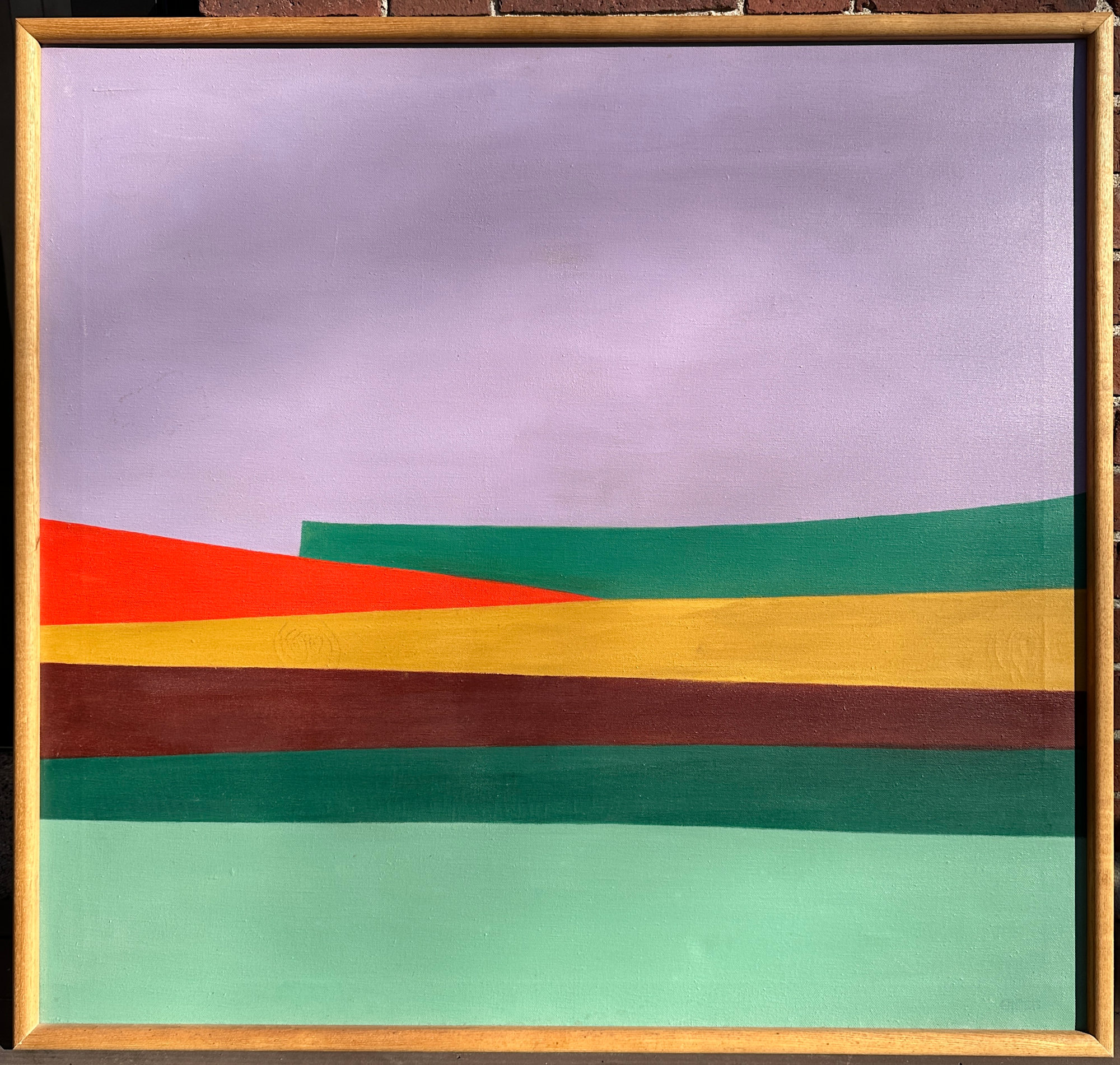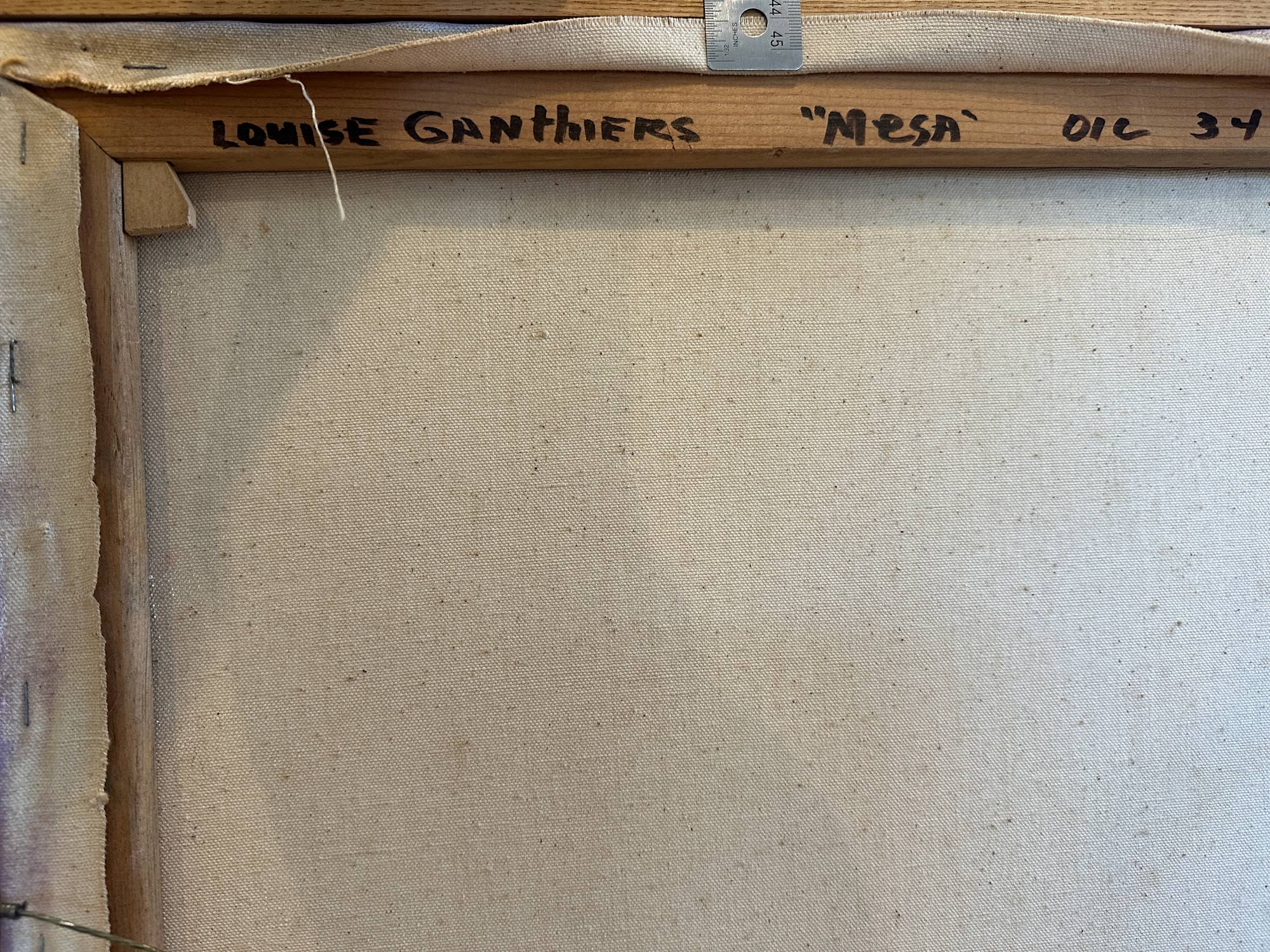 Oil painting on canvas of an abstracted desert landscape titled 'Mesa' by Taos modernist Louise Ganthiers (1907-1982) in palette of purple, turquoise, orange, and ochre. Original oak frame. Born in New York City, Ganthiers studied at the Art Students League and the Brooklyn Museum. She moved to Taos, New Mexico in 1949 and became a founding member of the Taos Art Association in 1952. She is considered one of the "Taos Moderns", a group of artists working in the 40s, 50s and 60s including Agnes Martin. Beatrice Mandelman, and Janet Lippincott.