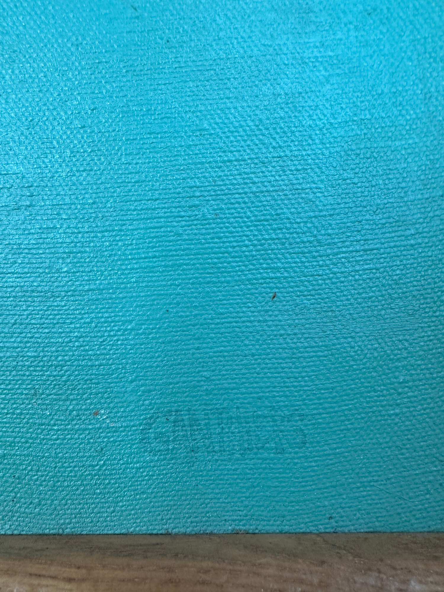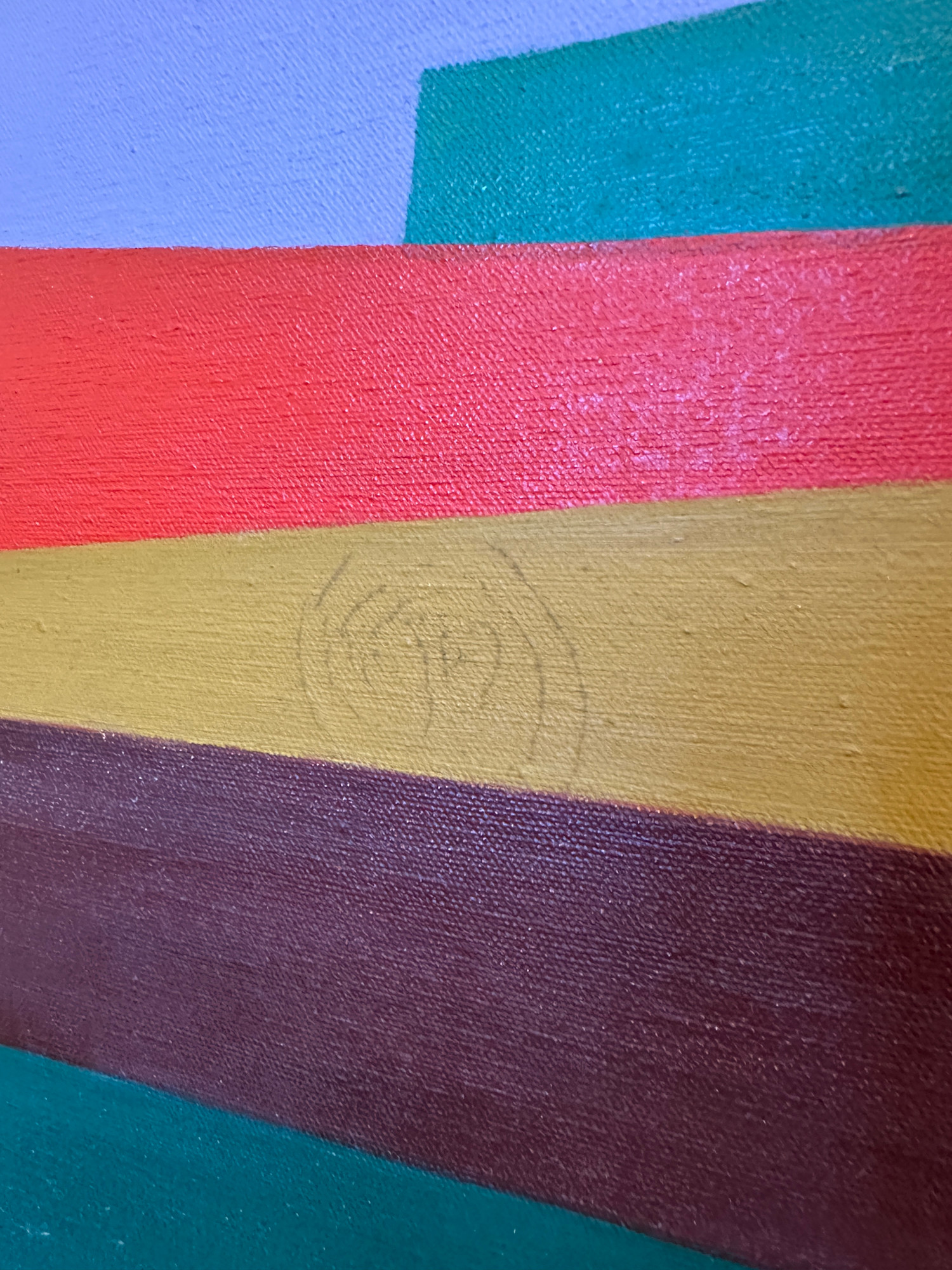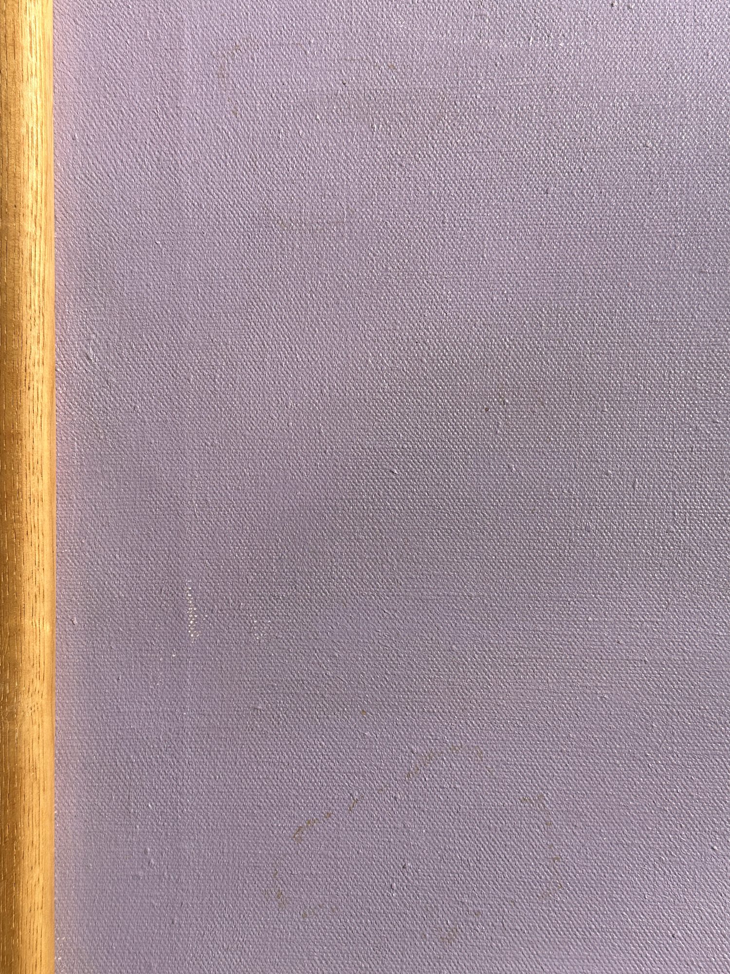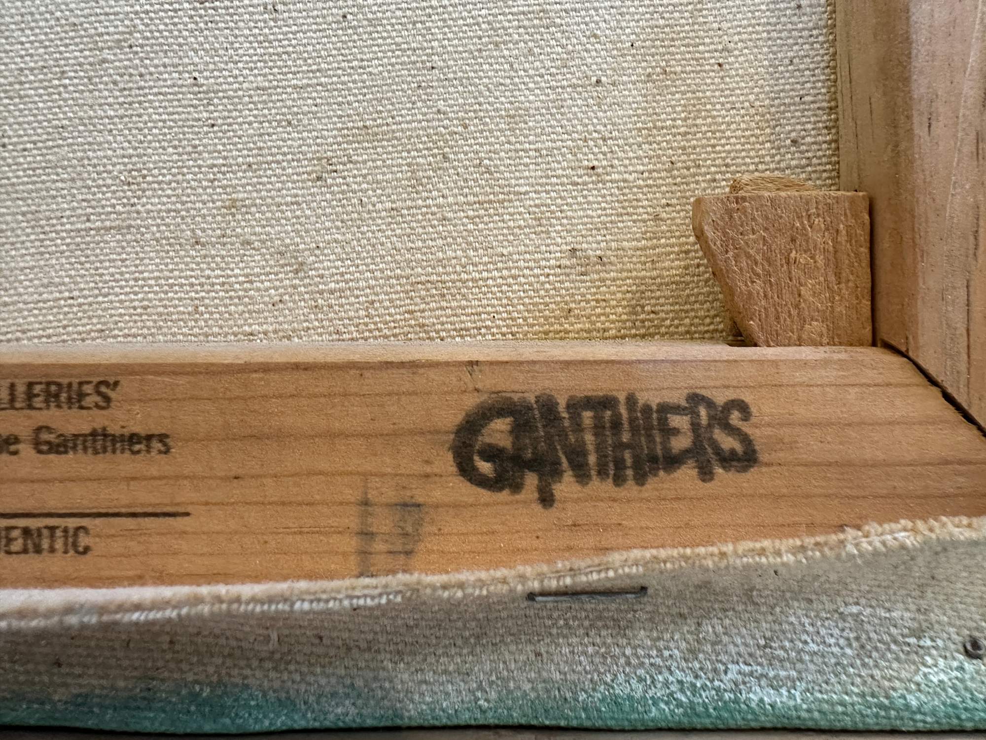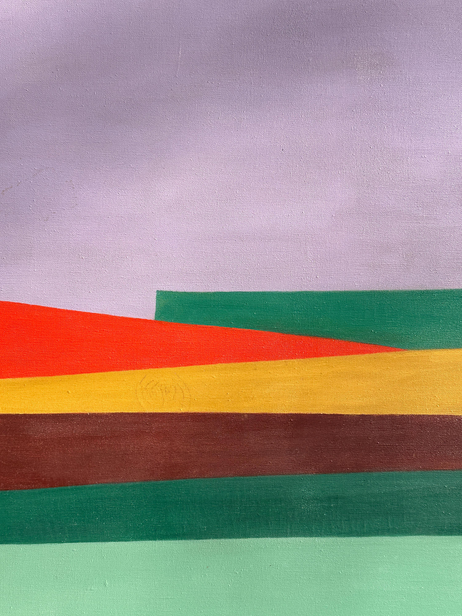 Oil painting on canvas of an abstracted desert landscape titled 'Mesa' by Taos modernist Louise Ganthiers (1907-1982) in palette of purple, turquoise, orange, and ochre. Original oak frame. Born in New York City, Ganthiers studied at the Art Students League and the Brooklyn Museum. She moved to Taos, New Mexico in 1949 and became a founding member of the Taos Art Association in 1952. She is considered one of the "Taos Moderns", a group of artists working in the 40s, 50s and 60s including Agnes Martin. Beatrice Mandelman, and Janet Lippincott.