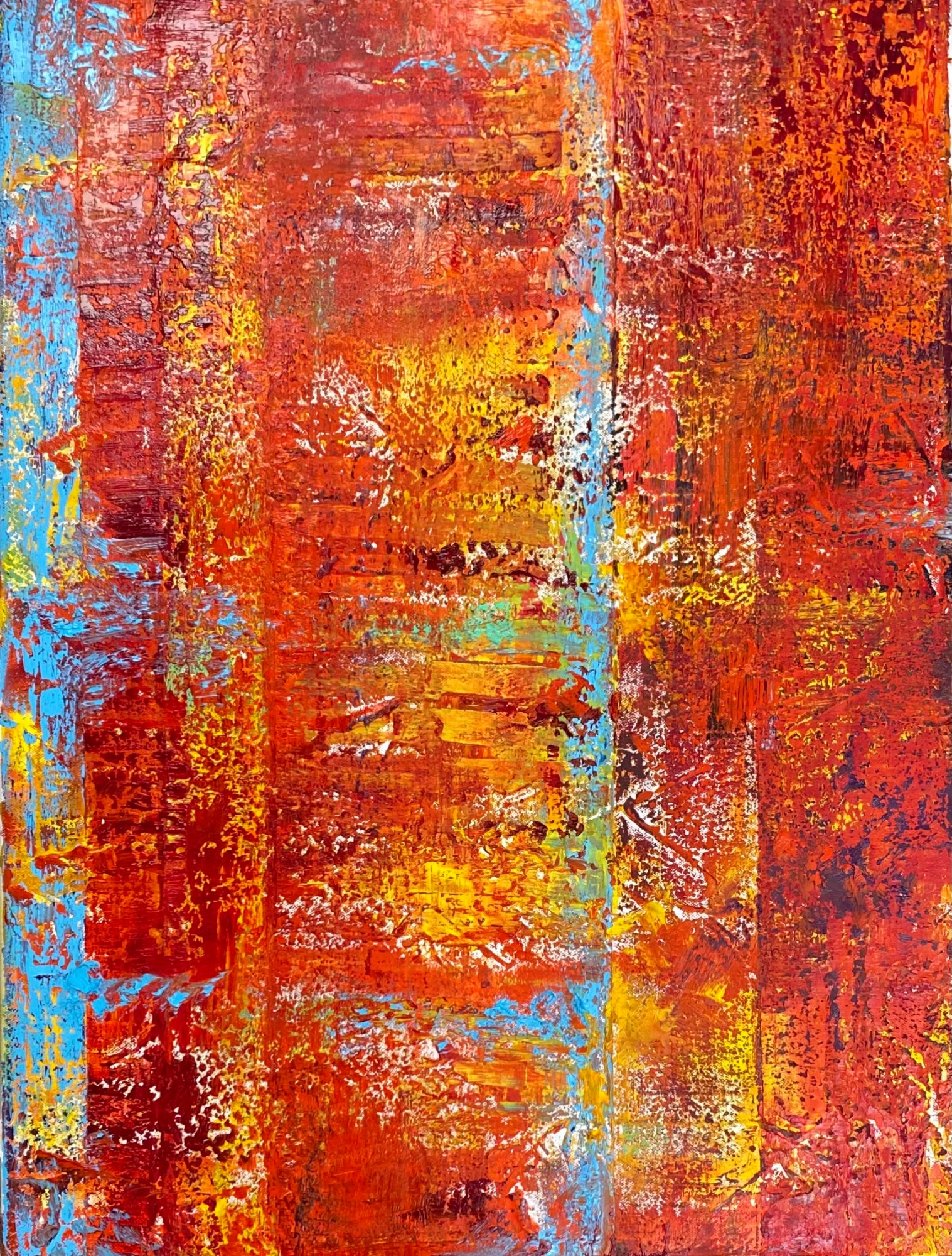 Abstract work using a squeegee, palette knife, and tape. This work expresses color in a dramatic bold way.