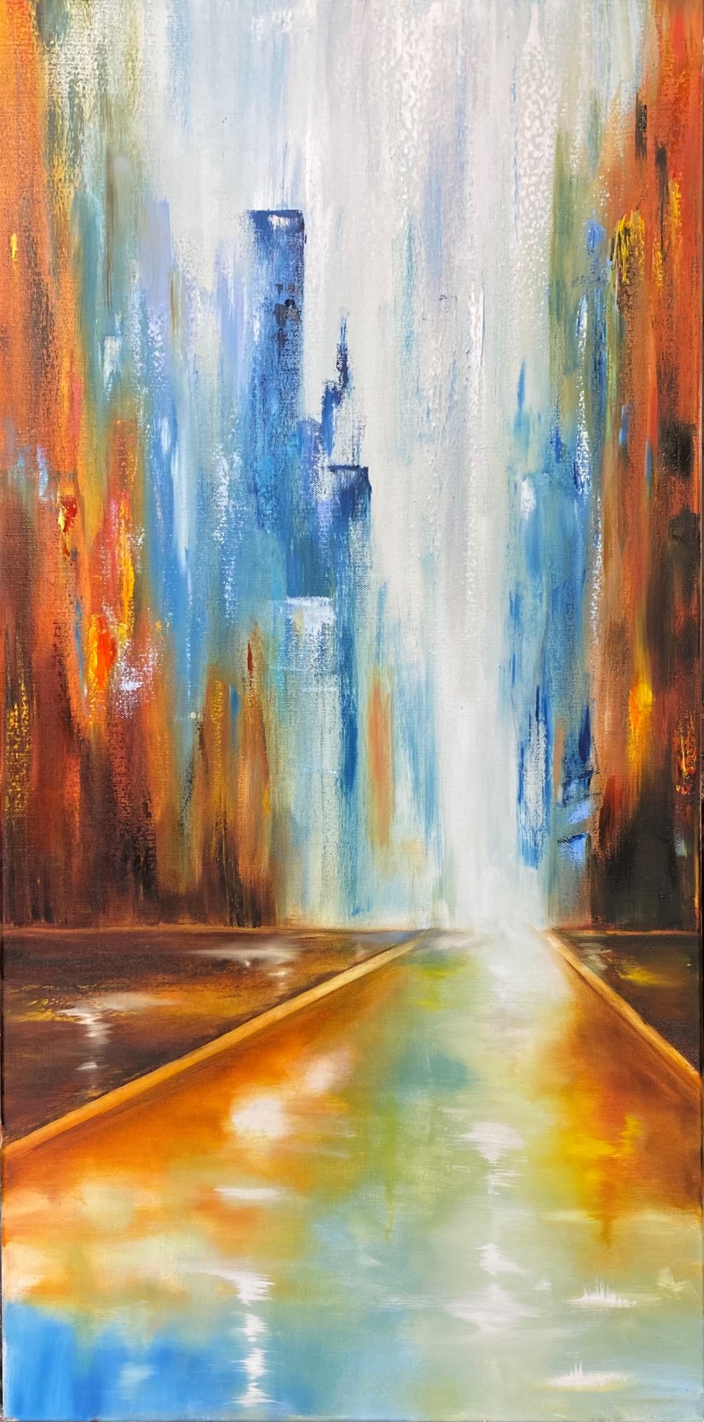 Oil on Canvas. Abstract cityscape inspired by my many trips to NYC.