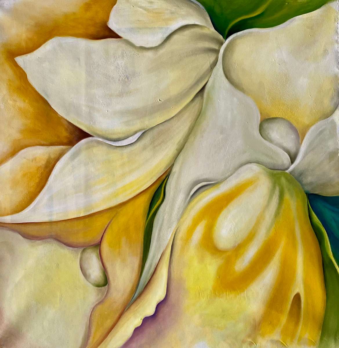 This painting is a captivating exploration of form and color, focusing on the intricate details of flowers.. The artist has masterfully utilized a close-up perspective, transforming the natural forms into a series of sweeping curves and folds. The palette, dominated by soft yellows, whites, and hints of green, creates a serene and harmonious composition. The gentle transitions between shades are skillfully executed, lending the piece a sense of softness and fluidity.