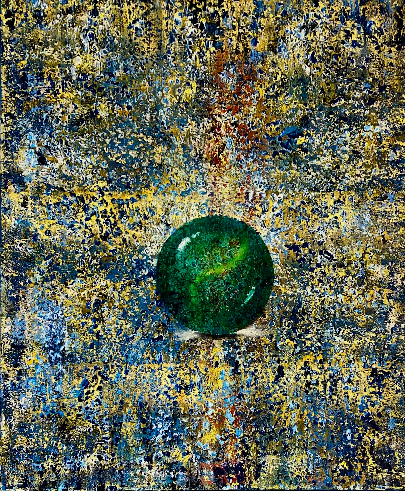 The use of color is bold and evocative, with the green marble providing a focal point that draws the eye into the piece amidst the busy backdrop. The textural elements in the background add intrigue and complexity, inviting viewers to explore the interplay of colors and textures which create a sense of depth and layering.
