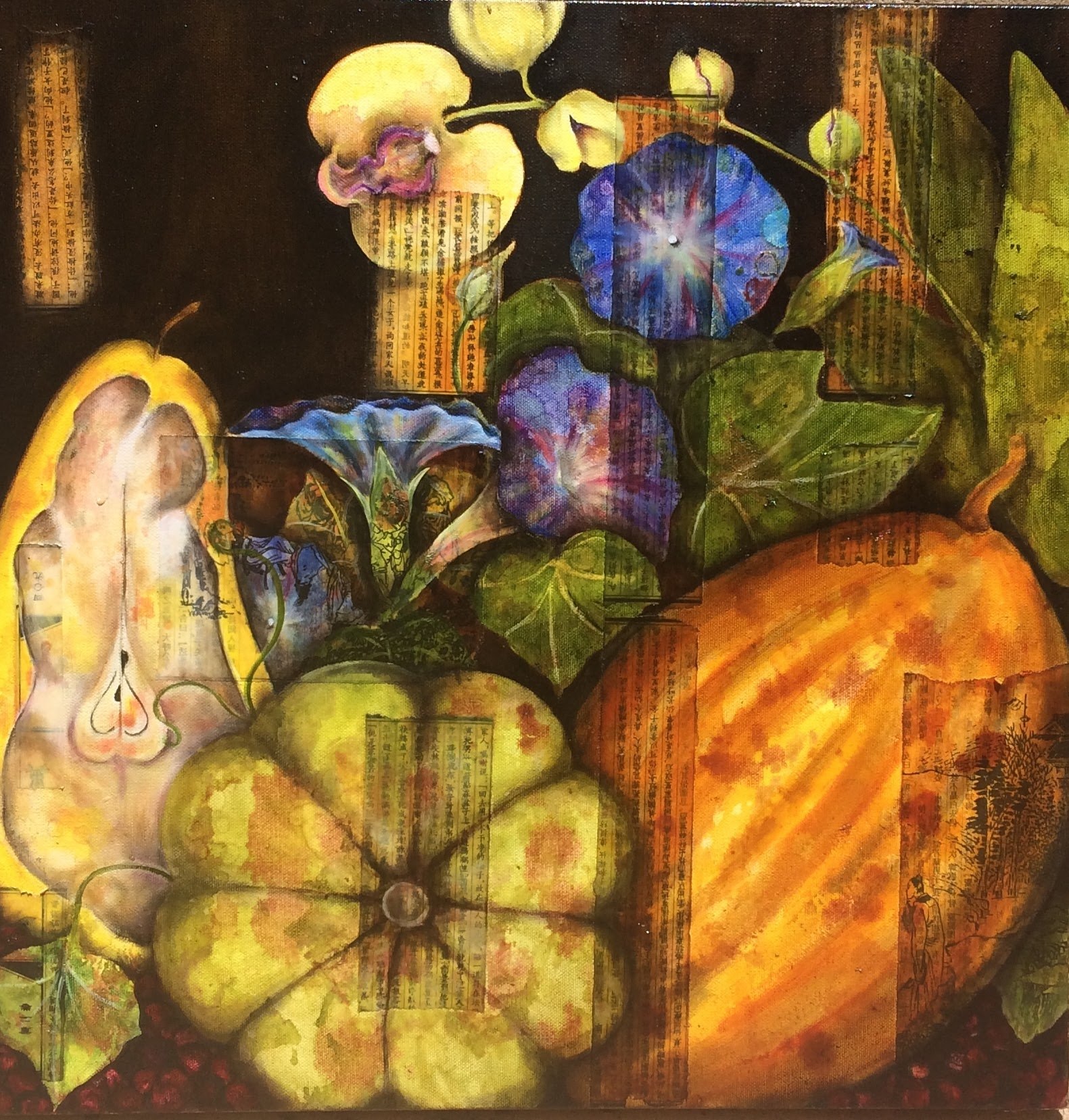 Universal Language Series with 100-year-old manuscript pages adhered with book binding glue painted over with oil paint. Contact via website to purchase