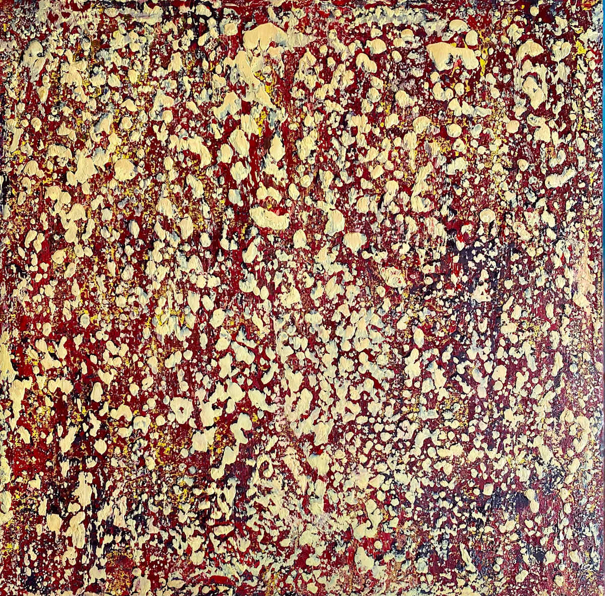 This artwork is a captivating abstract composition, featuring an intricate interplay of rich reds and vibrant yellows with splattered patterns and palette knife work throughout. The texture is dynamic, with a delightfully chaotic arrangement of colors and forms that dance across the canvas. The use of splatters, palette knife, and drips injects energy into the piece, reminiscent of action painting, and it deeply engages with the viewer’s visual senses.