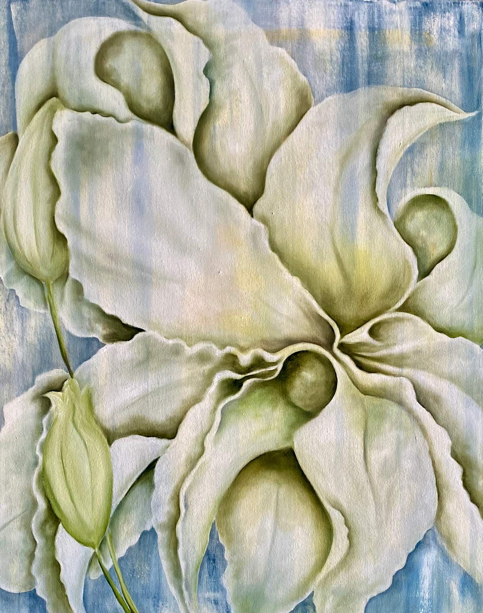This artwork features an elegant close-up depiction of an abstracted lily rendered in soft, muted tones of white and pale green. The petals are large, flowing, and gracefully curved, with delicate shading that emphasizes their texture and depth. The artist skillfully uses light and shadow to create a sense of volume, making the petals seem almost three-dimensional. The background is a faint blue wash that contrasts subtly against the lighter flower, allowing it to remain the focal point without distraction. The overall composition is balanced, inviting the viewer to appreciate the intricate forms and gentle curves of the flower.