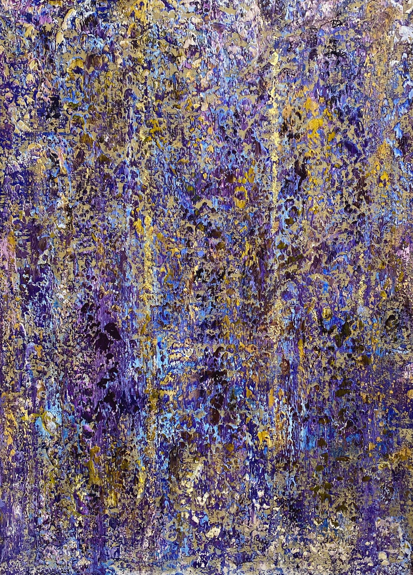 This artwork is a vibrant and textured abstract composition dominated by rich layers of purples, blues, and golds. The surface is densely covered with intricate patterns, created through the thick application of paint, resulting in a tactile, almost mosaic-like effect. The interplay of light and dark areas adds depth and movement, with golden hues reflecting and bringing a subtle luminosity to the piece. The overall composition suggests a complex, immersive environment, inviting viewers to explore the nuances of color interplay and texture within an enigmatic, almost celestial space.