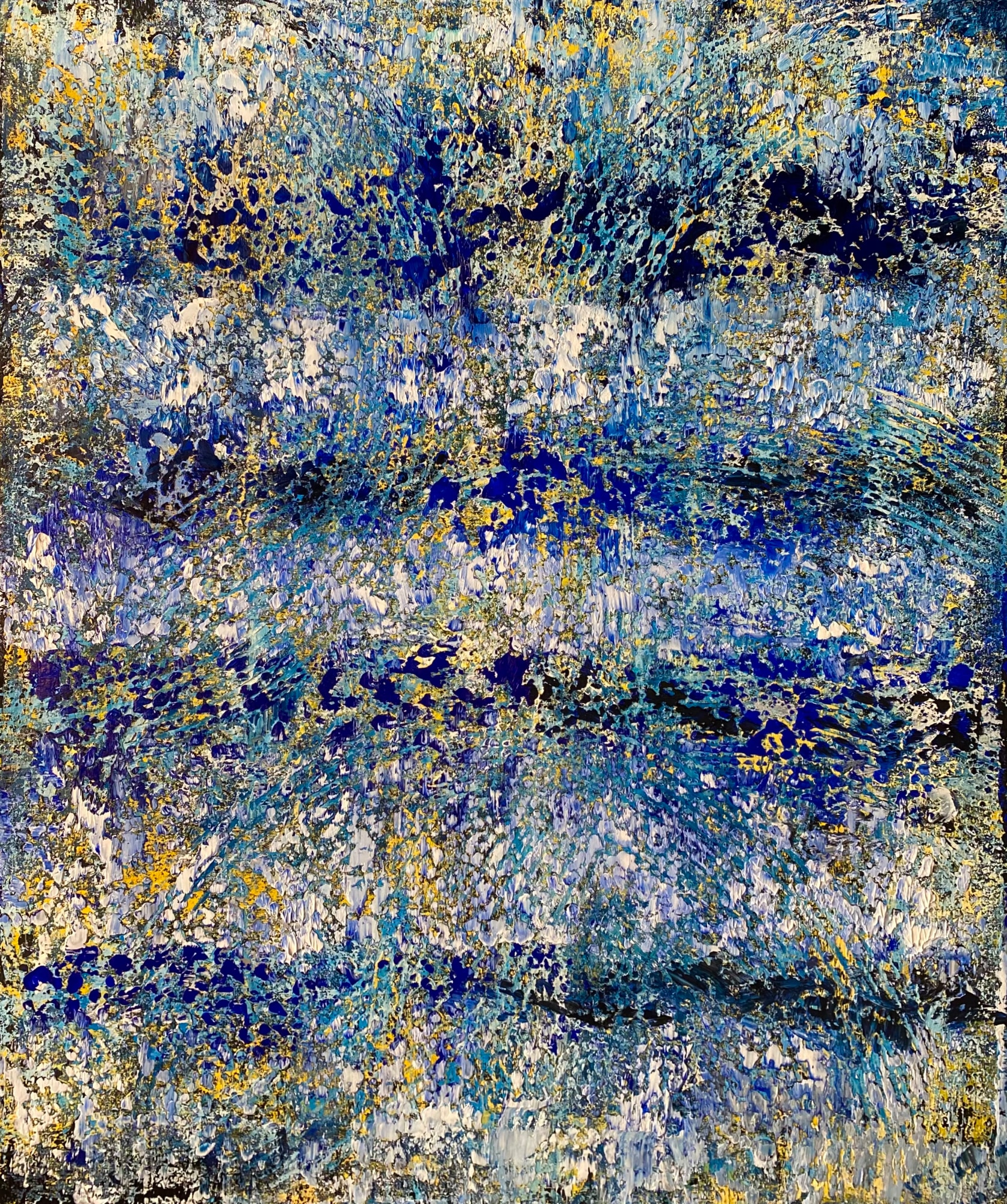 This artwork is a vibrant and richly textured abstract composition dominated by shades of blue, interspersed with gold, white, and hints of green. The surface is intricately layered, with patterns that suggest a sense of motion and depth, almost evoking the feeling of cascading water or a dynamic underwater scene. The gold flecks create a striking contrast against the cooler tones, adding a sense of luminosity and warmth amidst the predominantly cool palette. The textural quality hints at the heavy application of paint through techniques using a squegee and a palette knife, contributing to the tactile richness and visual complexity of the piece.