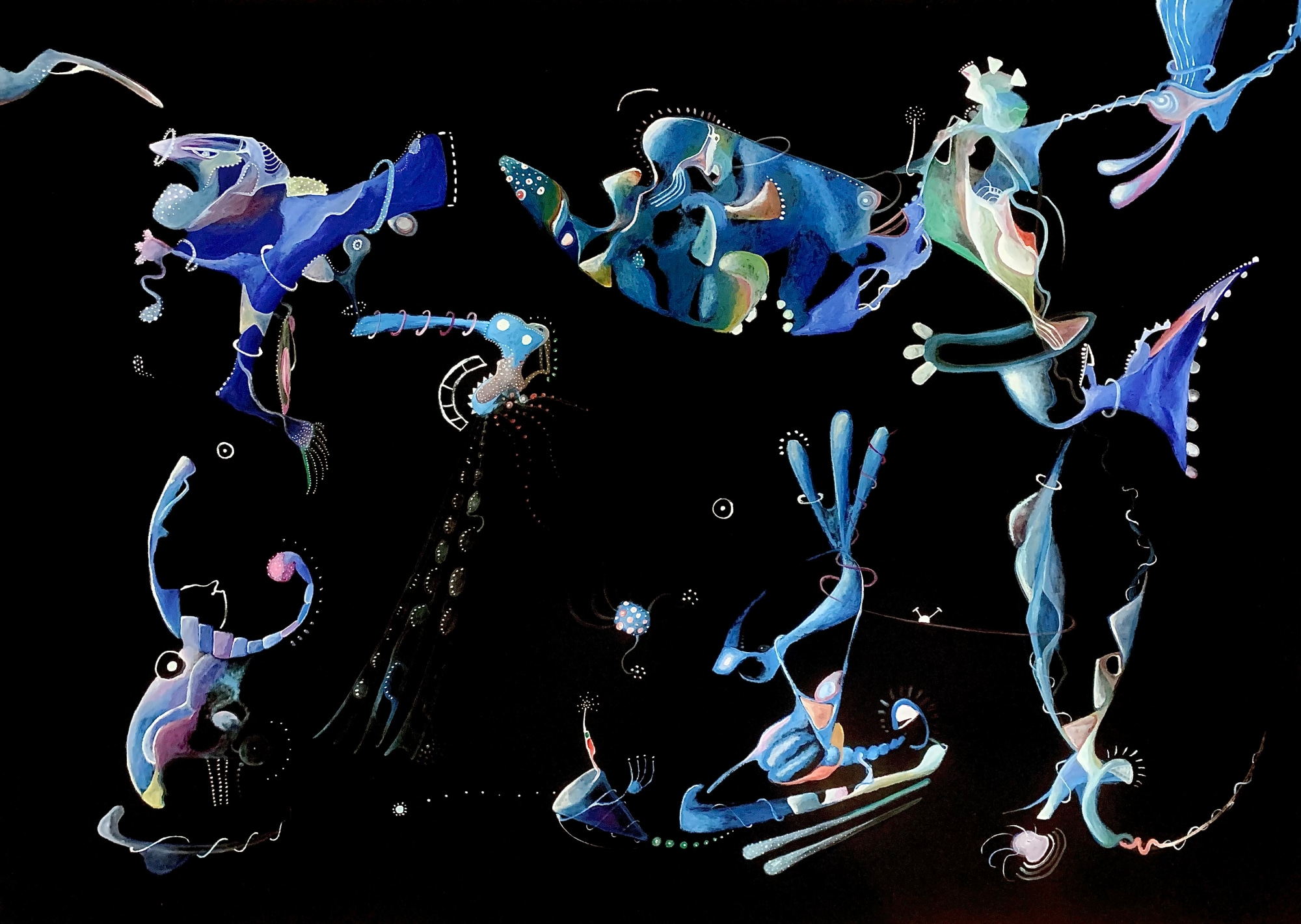 The bold use of the color blue in the painting "Nova" conveys a sense of energy and movement that reflects the dynamic and ever-changing nature of the figures and their relationships.