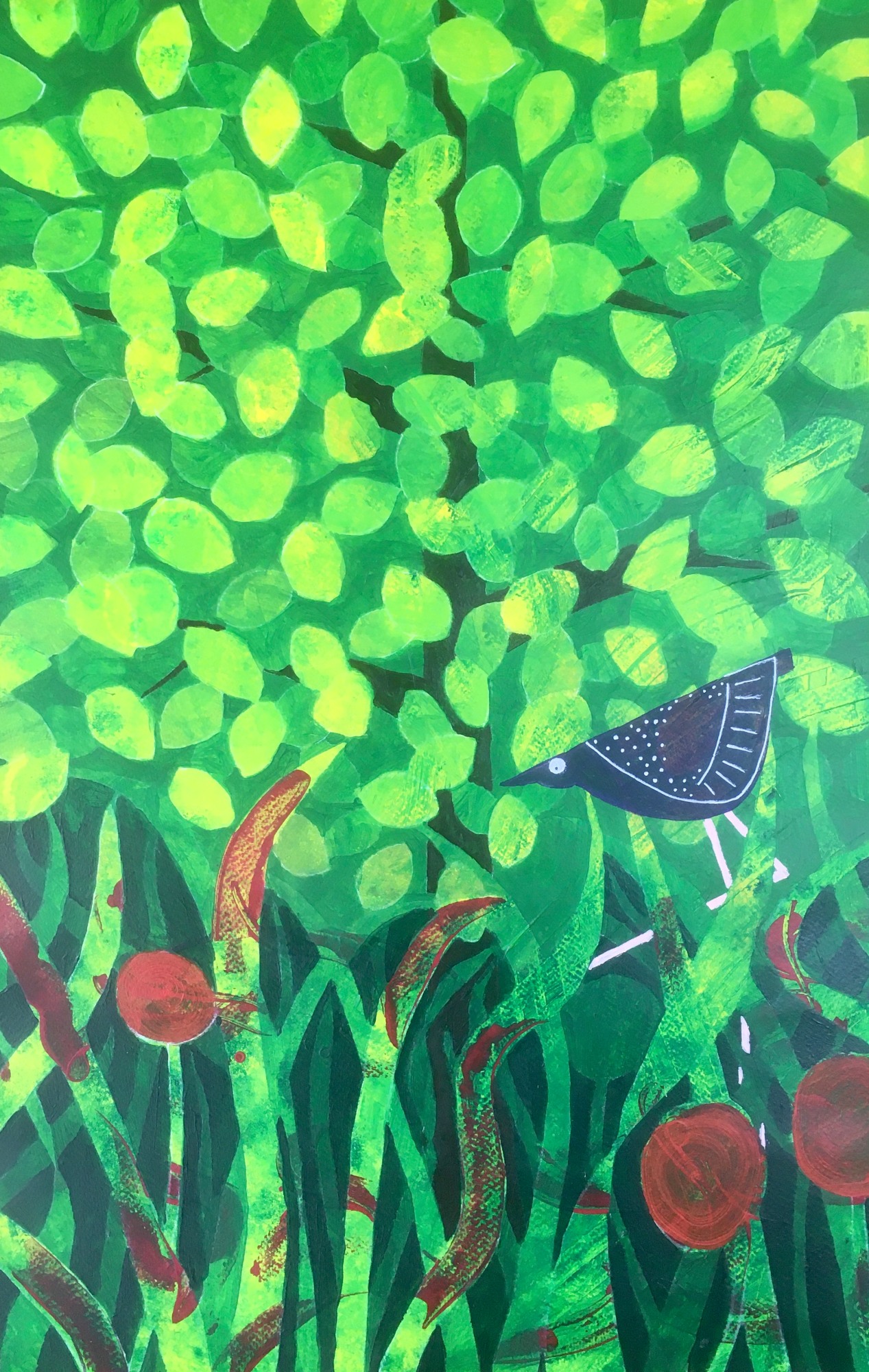 I have been making both abstract and figurative paintings, although quite a number of them have a historical origin, this work called "Out for a stroll" is an abstract work. The underlying layer is roughly applied, layers of color and a few strokes of yellow and green were added and subsequently scraped, rubbed, or treated with alcohol splatter using the emotions I was feeling at the time. Subsequently I applied a few layers of transparent greens, using a negative technique, recreating, out of the chaos, a tranquil environment for myself resulting in an imaginary bird out for a stroll against a backdrop of trees and leaves.