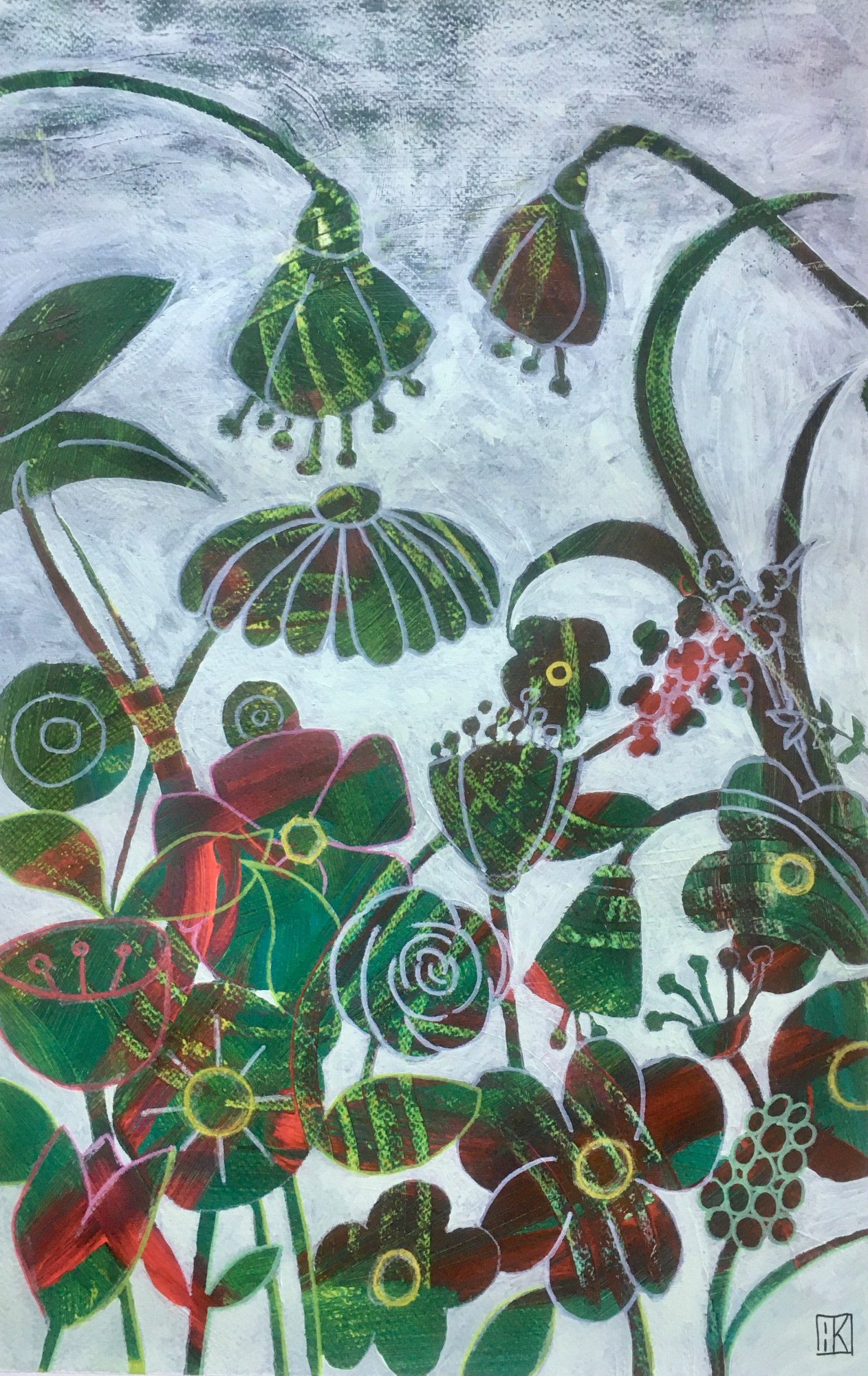 I have been making both abstract and figurative paintings, although quite a number of them have a historical origin, this work called "Spring” is an abstract work with some realism in the background. The underlying layer is roughly applied, layers of color and a few strokes of yellow and red were added and subsequently scraped, rubbed, or treated with alcohol splatter using the emotions I was feeling at the time. Subsequently I applied a few layers of transparent greens, using a negative technique, recreating, out of the chaos, a tranquil environment for myself resulting in an imaginary of abstract flowers.