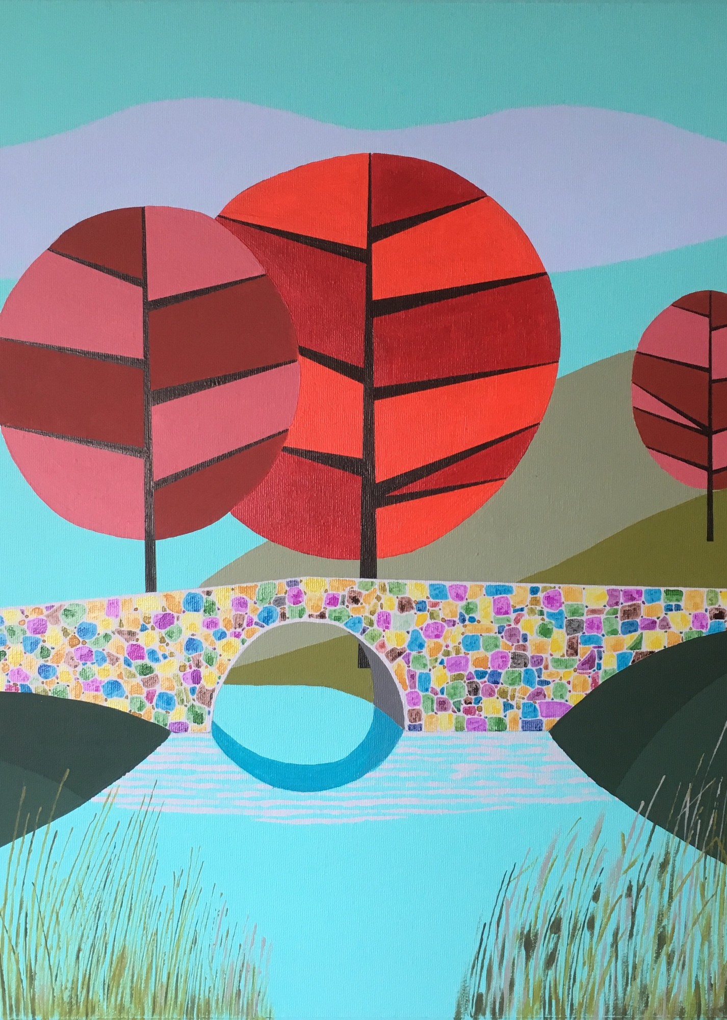 The painting is my interpretation of a bridge in Donegal, the enchanting, mystical and magical forces of that part of the country amplified by the colors in the bridge and partially missing reflections on the water.