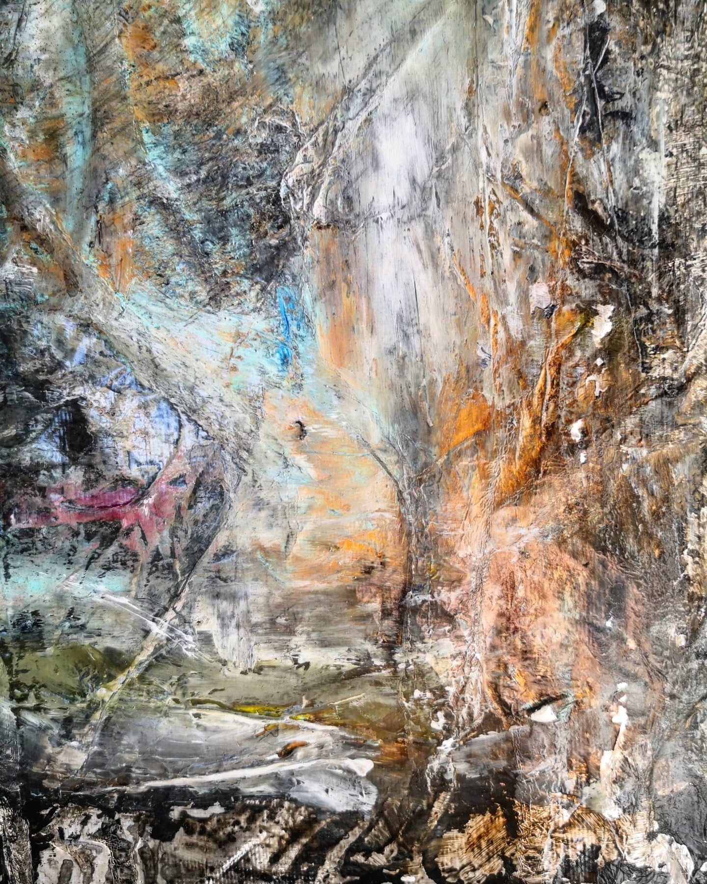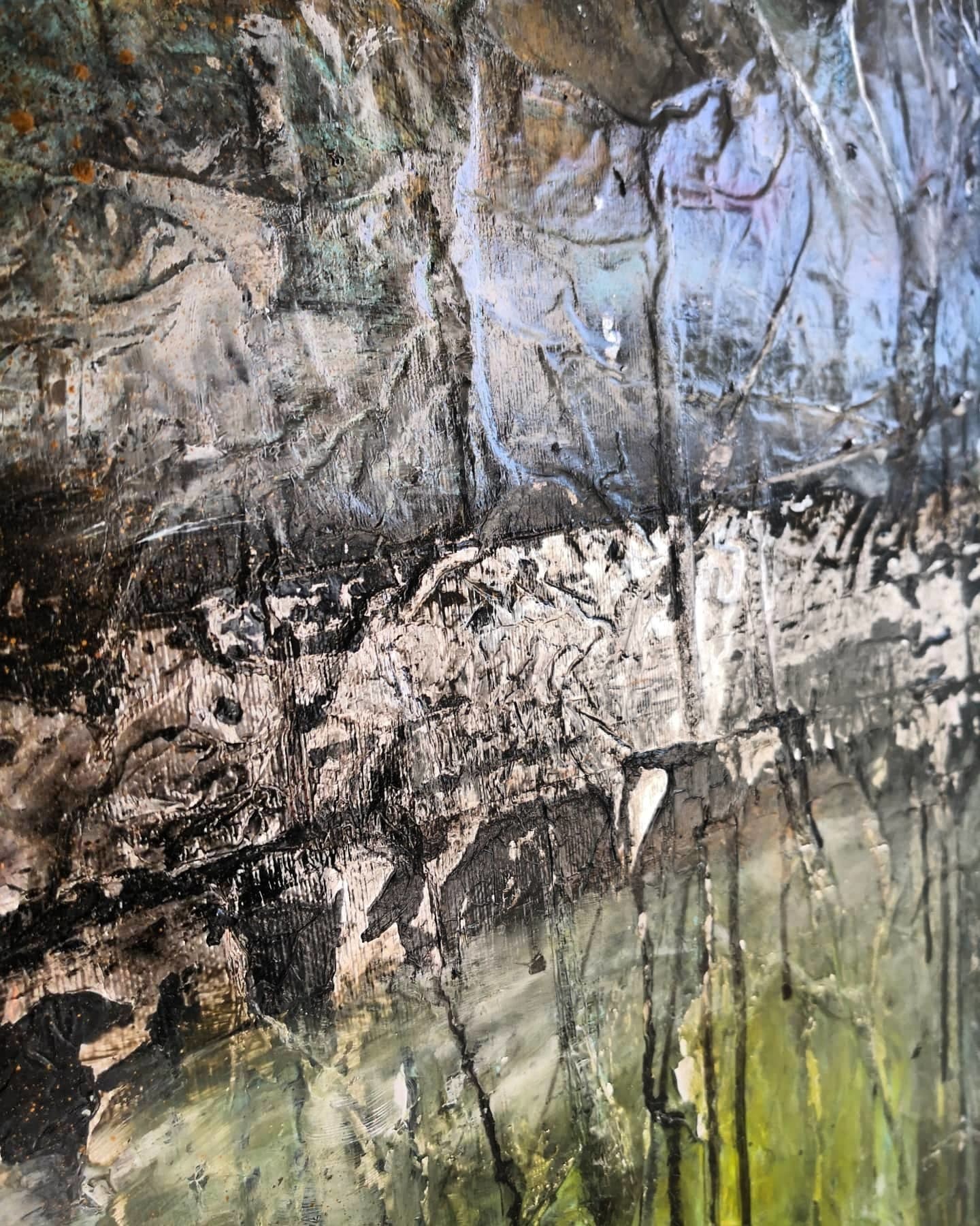 MessageHere's an example of how color and texture inspiration work with me. Oftentimes, I paint from nature but sometimes a color or texture combo will strike me--and I'll play with that idea in the studio. Take for example this this cracked cement wall (2nd image) I photographed while on a walk. Here, you can see the elements of the photograph reflected in the painting by using mixed media. This time, I used metalic foil and acrylic paint to enhance the elements of metal and air. The grey-yellow-green wall with the silver-blue sky and fence are all in there.