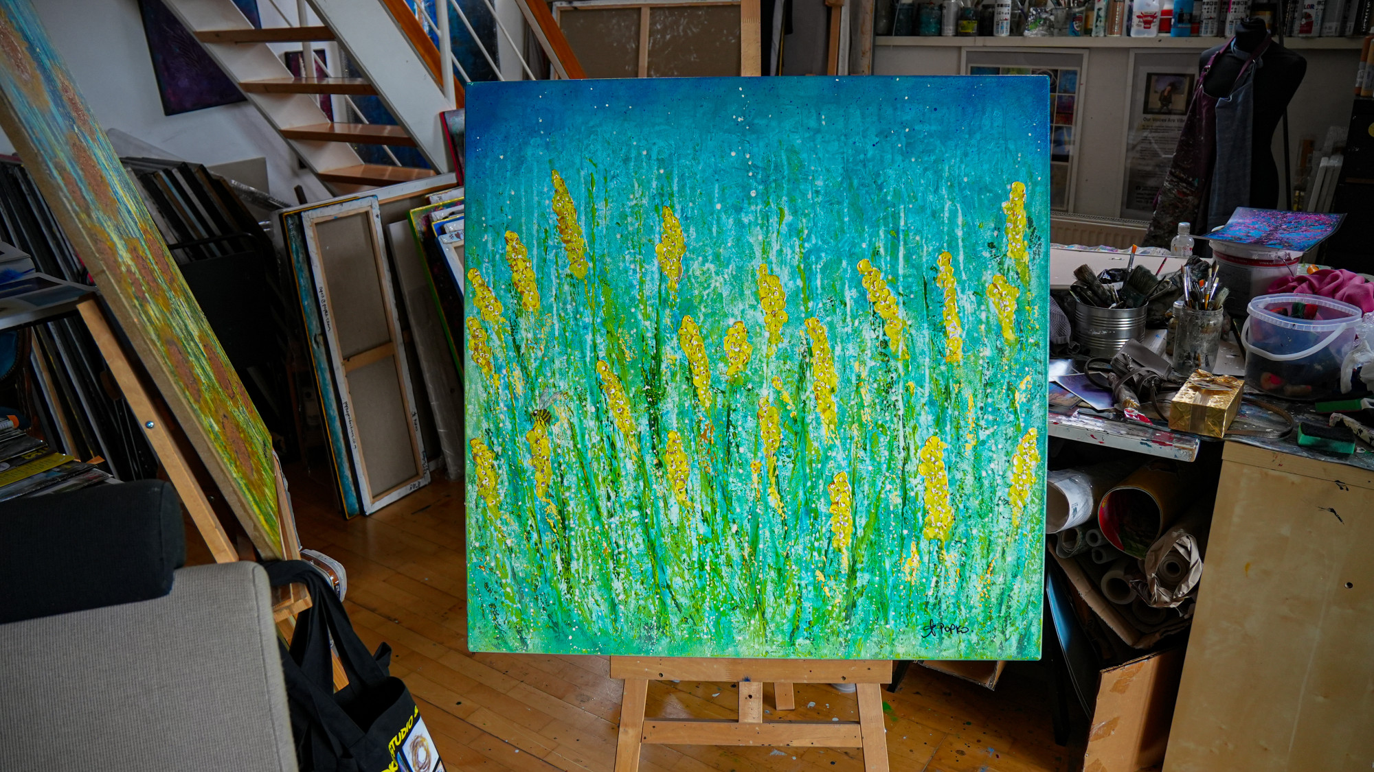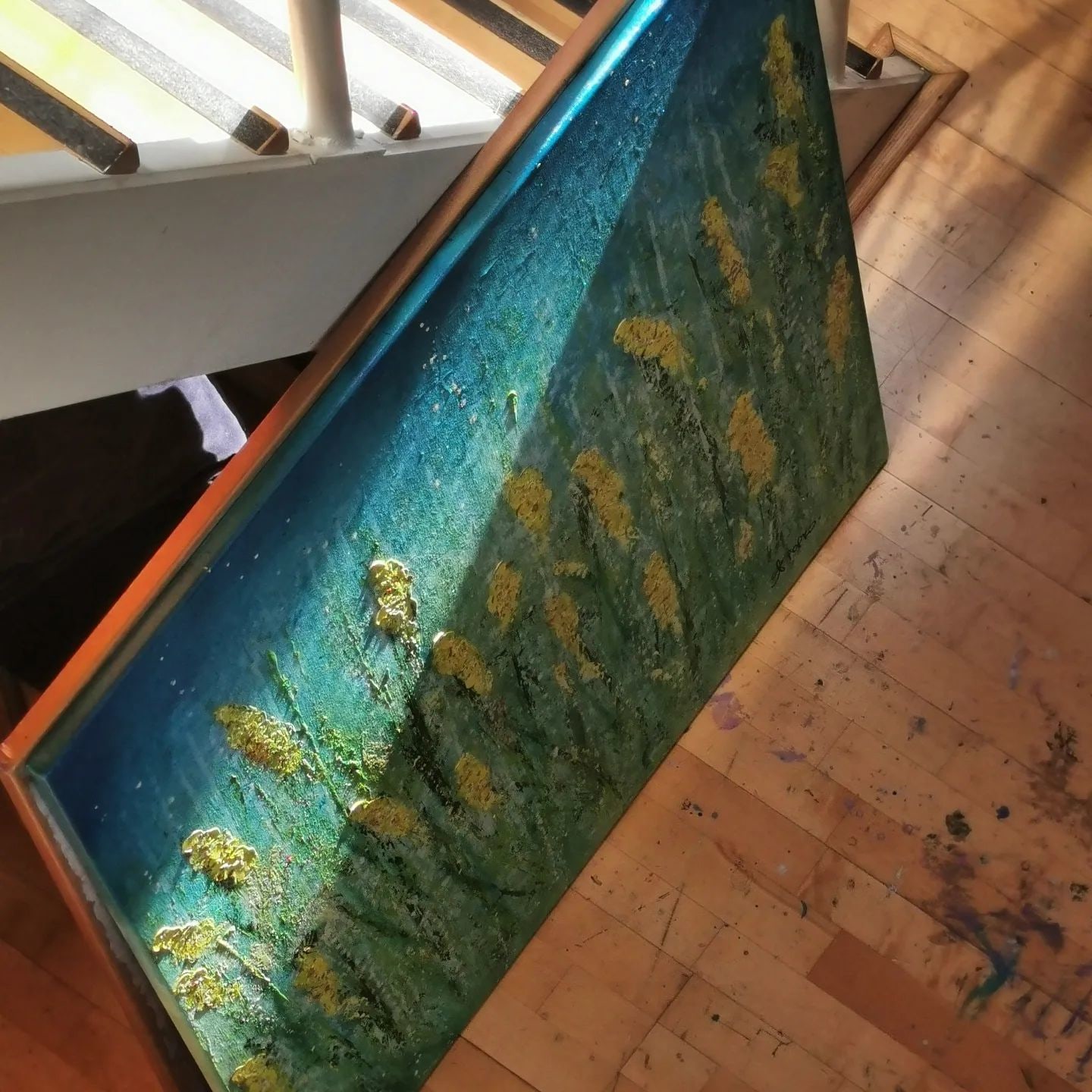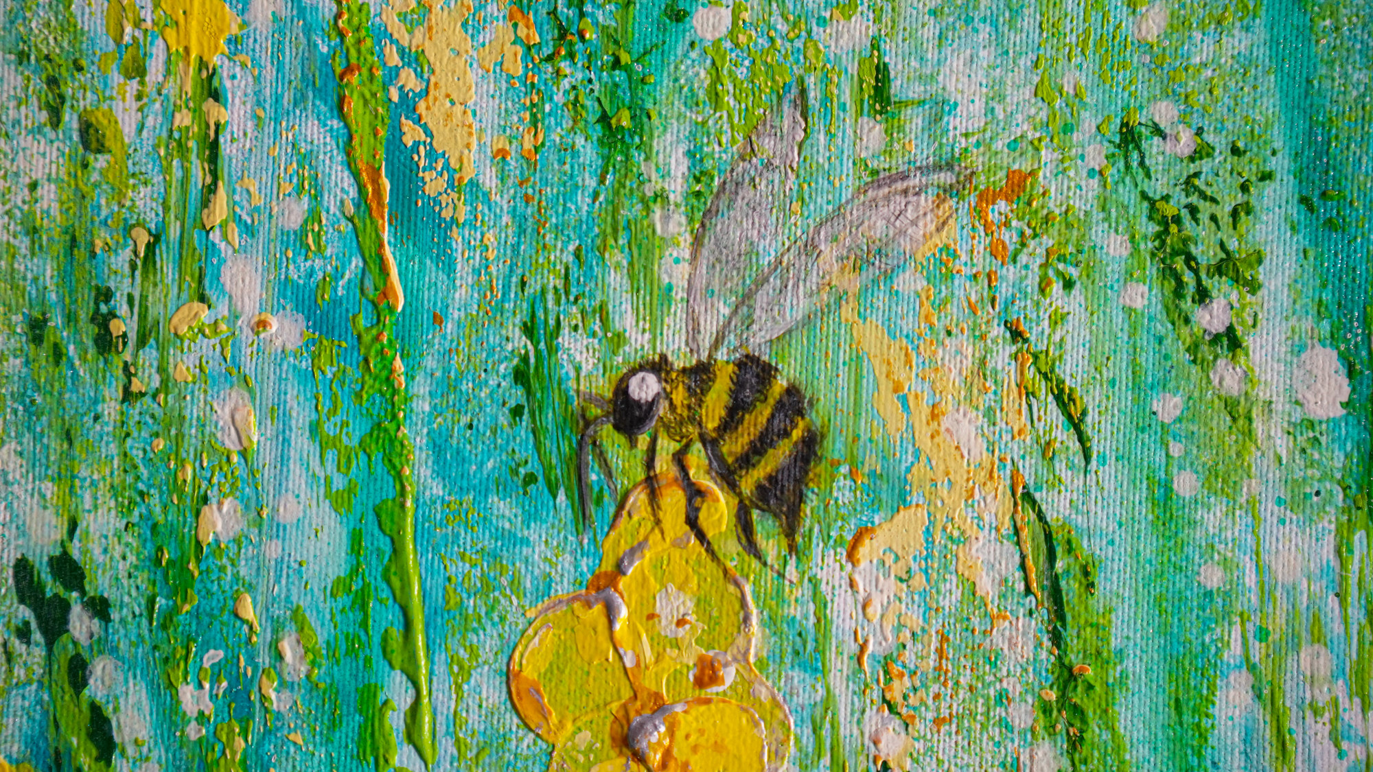 This one has a great story. I painted it on a warm, sunny day out on the balcony.๐ Just as I thought I was finished, a REAL honeybee flew onto the balcony, hovered over the yellow flower (I had just painted) and sat on it!๐ I was so surprised and happy (that was the best compliment I had all week that she thought it was real!). Immediately, though, felt sorry once I realized the bee would have yellow paint on its feet! ๐Oh no! ๐ฏI brought the painting inside and decided to honor the bee with her portrait... Can you find it? ๐๐Instead of titling the piece with some flower name.... I call it "Honeybee", immortalized by how good she made me feel on that bright, warm day. ๐๐ #honeybee #aprilpopko #americanartist #pragueartstudio #reporyje #prague #acrylicpaintings #abstractart #interiordesign #fineart #abstractpainting #originalart #contemporaryart #abstraction #artseries #flowersandtrees #beeportrait #artwithmeaning #energyinart #energytransfer #abstractthinking #newartpiece #inspiredbynature