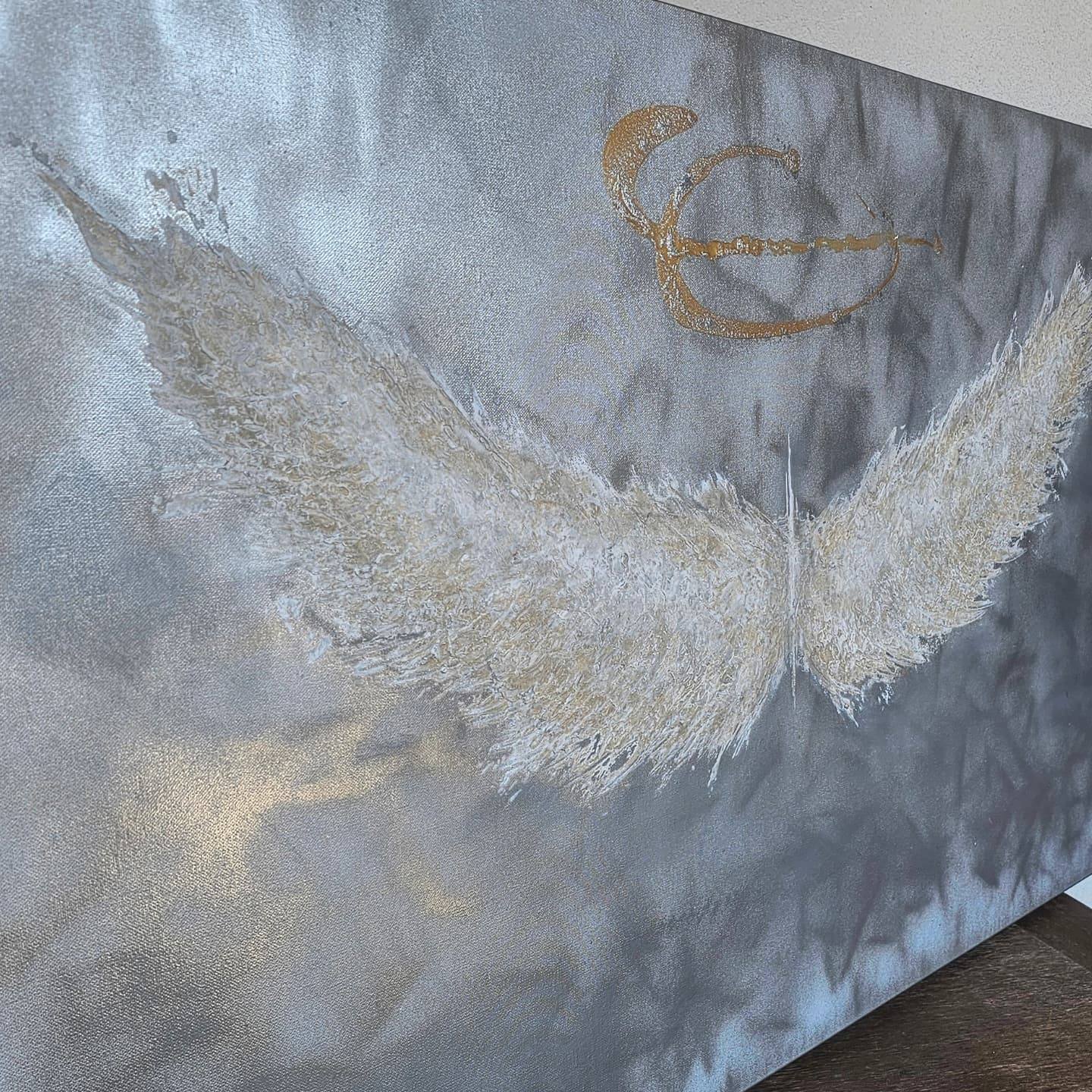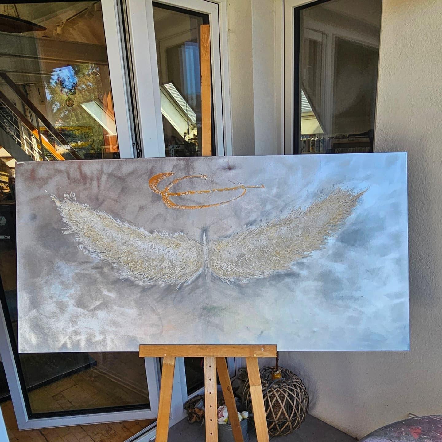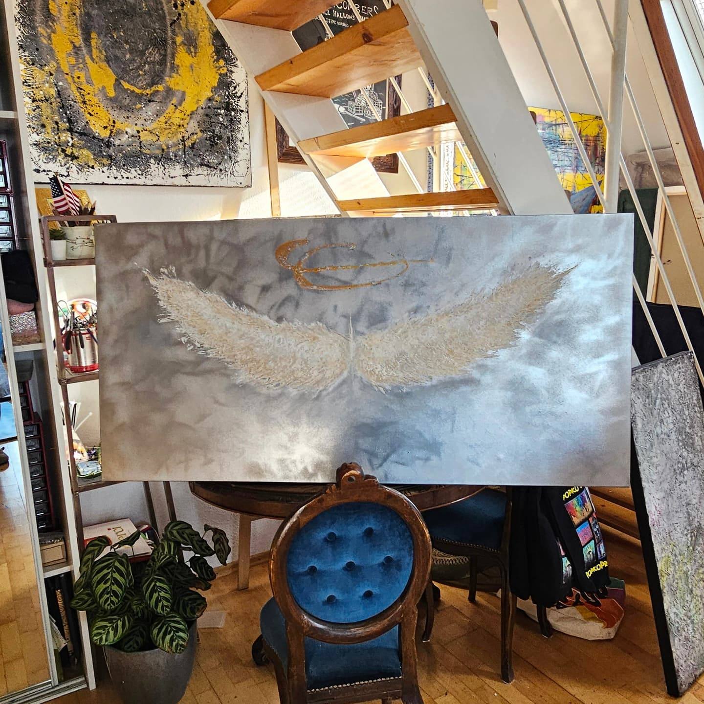 MessageI am very excited about these new, unexpected wings! 🪽 Maybe inspiration came to me because Valentine's Day is around the corner (?).💘 I fell in love with its silver reflection, texturized wings, golden halo, and the new size and format. I also dig the contrast between the high shine with the matte "feathers." 🪽 The back is signed, but I've not yet decided if I'll sign the front. It'll depend on its future owner. 😀If not sold this month, it'll be in my upcoming exhibition in March. Very exciting details to come...🎨🖼✨️🙌🪽