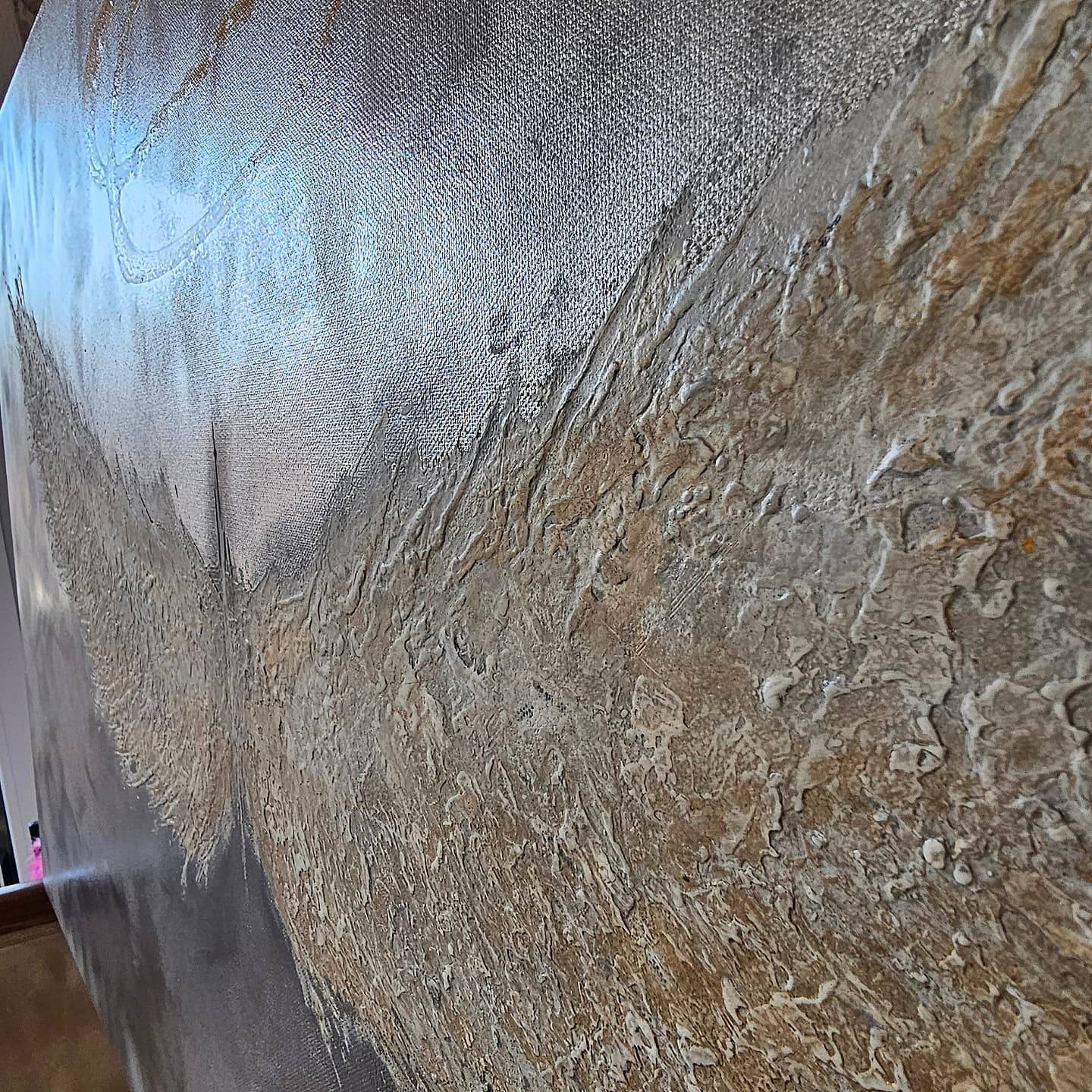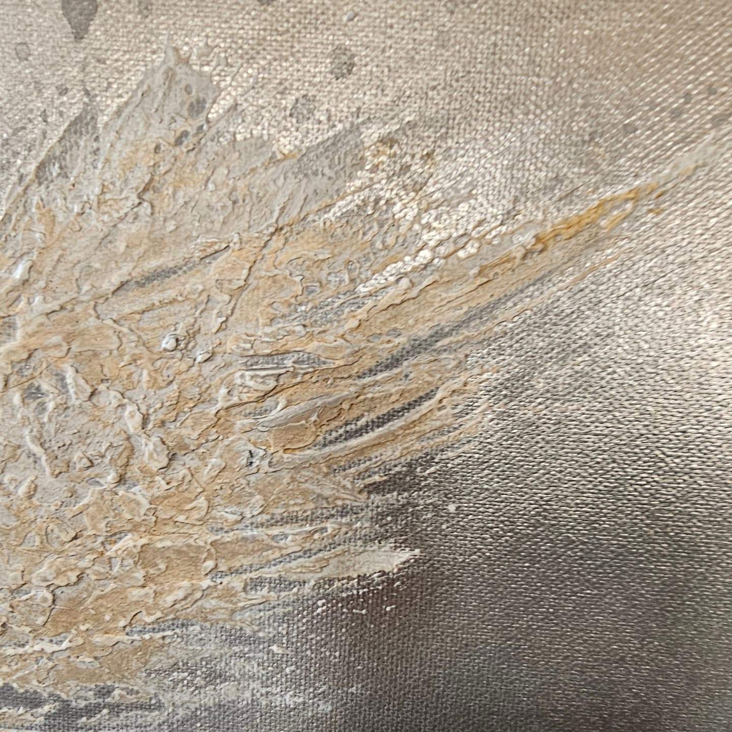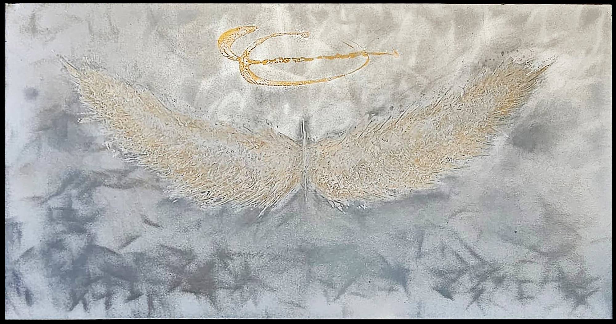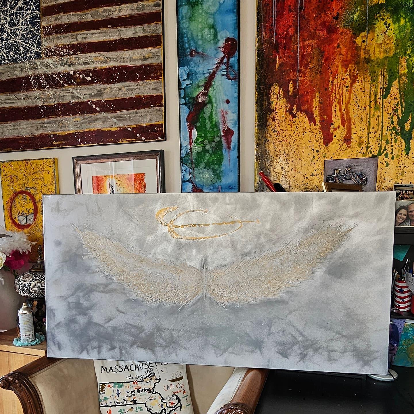 MessageI am very excited about these new, unexpected wings! 🪽 Maybe inspiration came to me because Valentine's Day is around the corner (?).💘 I fell in love with its silver reflection, texturized wings, golden halo, and the new size and format. I also dig the contrast between the high shine with the matte "feathers." 🪽 The back is signed, but I've not yet decided if I'll sign the front. It'll depend on its future owner. 😀If not sold this month, it'll be in my upcoming exhibition in March. Very exciting details to come...🎨🖼✨️🙌🪽