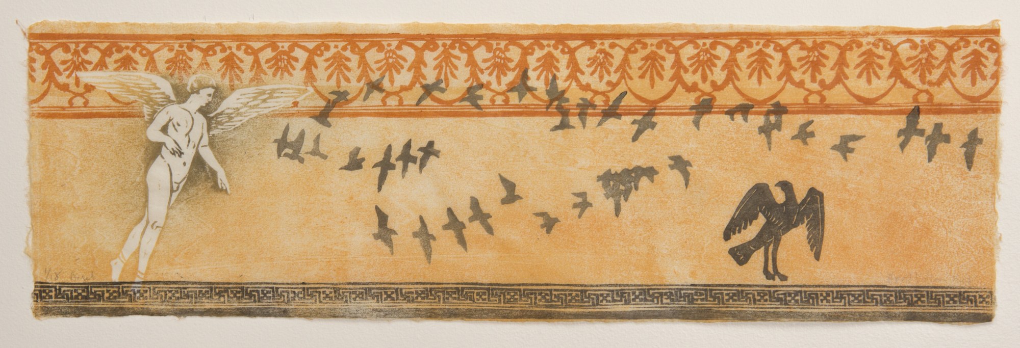 allover printing on small full deckle washi from Japanese Paper Place; Roman angel with birds flying across printed ochre ground, with flying birds