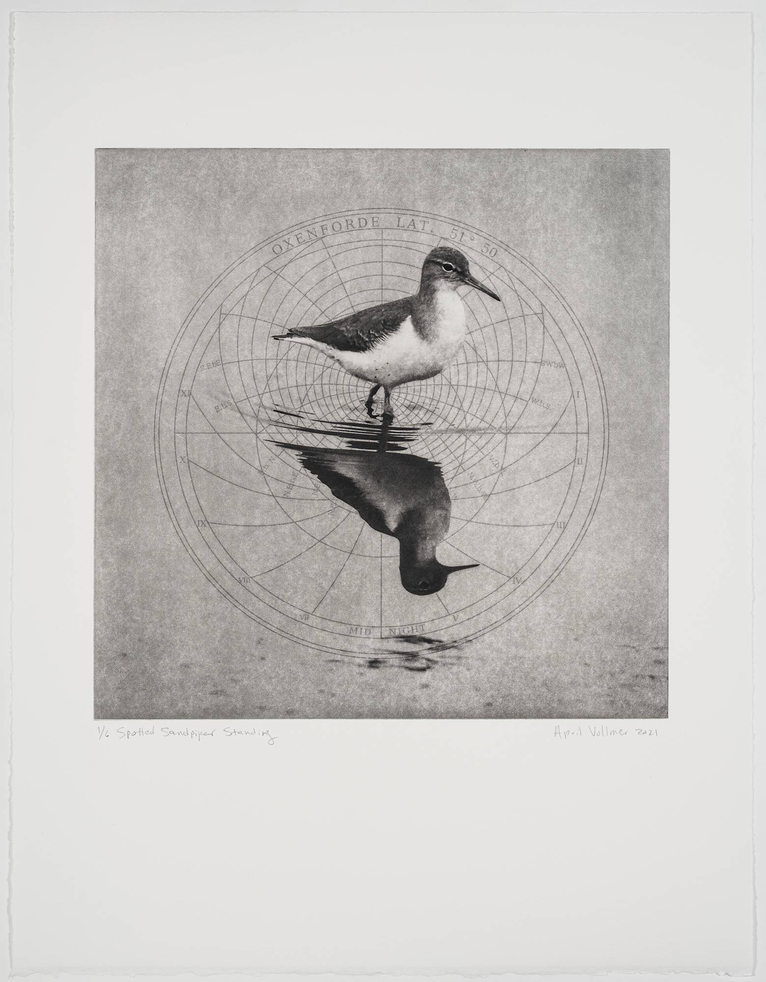 Birds on the Edge: Spotted Sandpiper Standing by April Vollmer  Image: Spotted sandpiper with its reflection centered on geometry of Archimedes' astrolabe