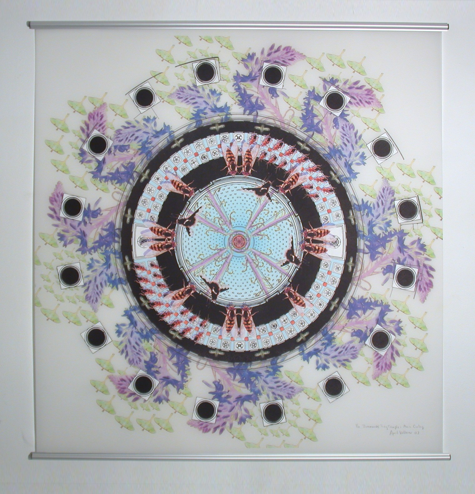Bramante's Tiny Temple Series: ceiling dome with flowers, syrphid flies and luna moths, digital on mylar with paper cutouts, 36 x 36 inches, $950