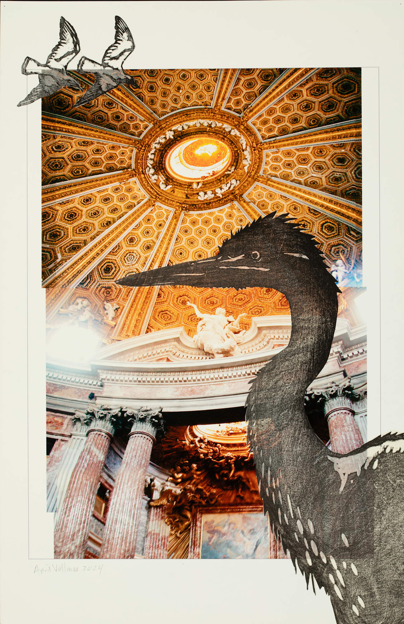 These prints are 11 x 17 inch test prints of my photographs of Italian architecture for the series Inside Out printed by Katy Martin in 2003, collaged with hand printed mokuhanga birds printed on lightweight washi.