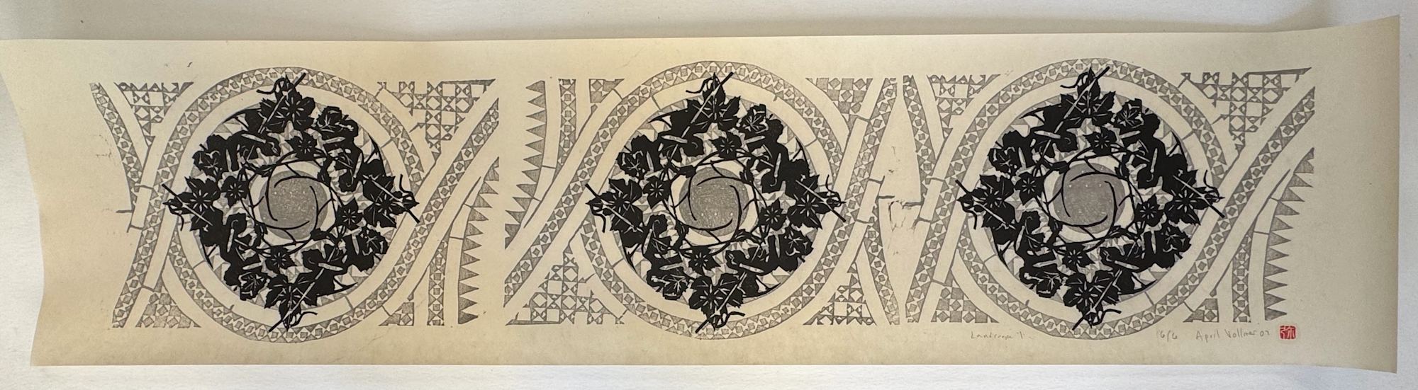 This series of eight landscapes was created by repeated printing of small blocks to create patterns. #1 is an edition of six, with a grape vine wreath printed against a background of repeating mosaic spirals, a mokuhanga woodcut on gampi. Edition 6/6 was mounted on sekishu washi by Nikol Markowitz at Moonlight Press.